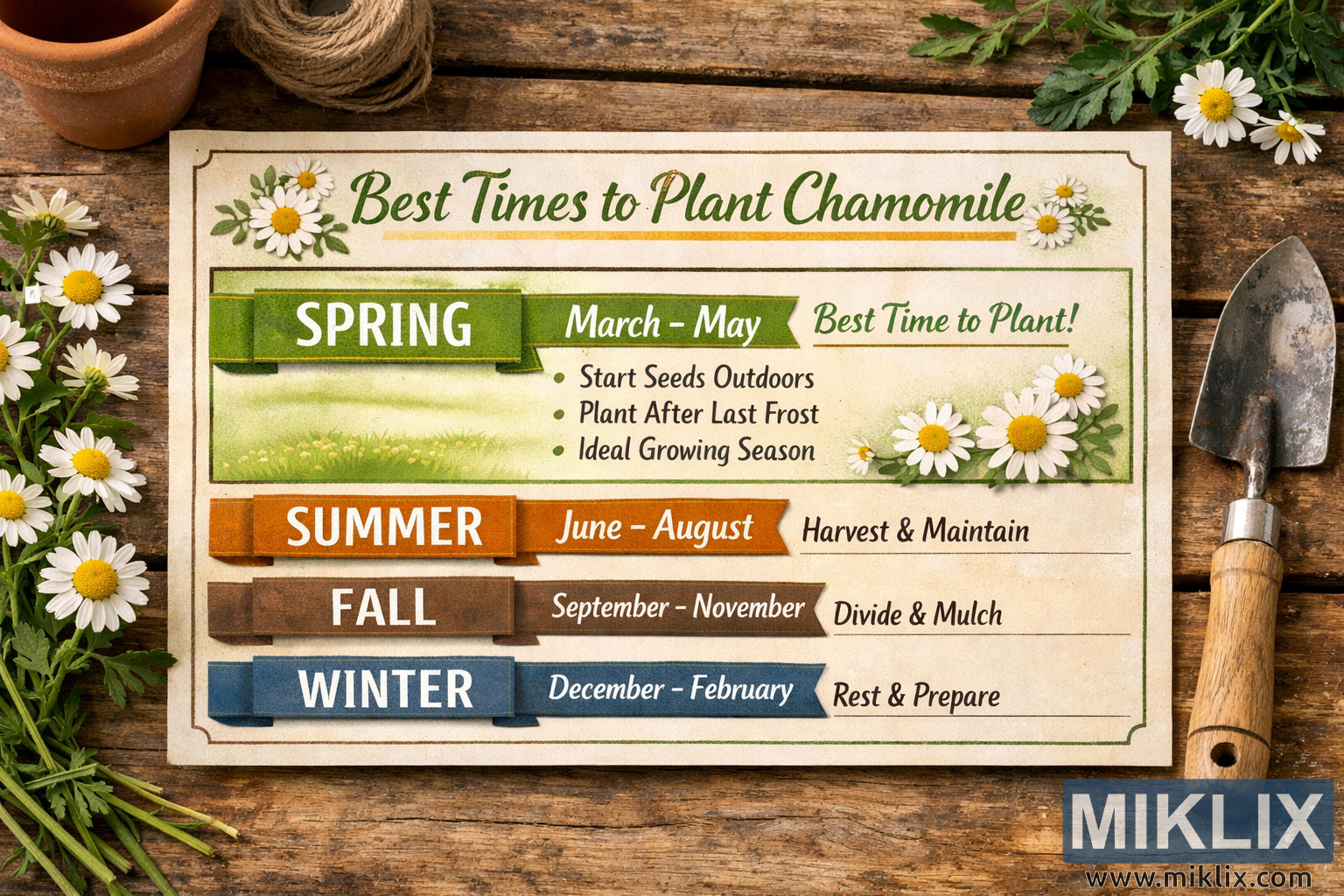 Landscape image of a rustic chamomile planting calendar on a wooden table, highlighting spring as the best season to plant, with seasonal gardening guidance.