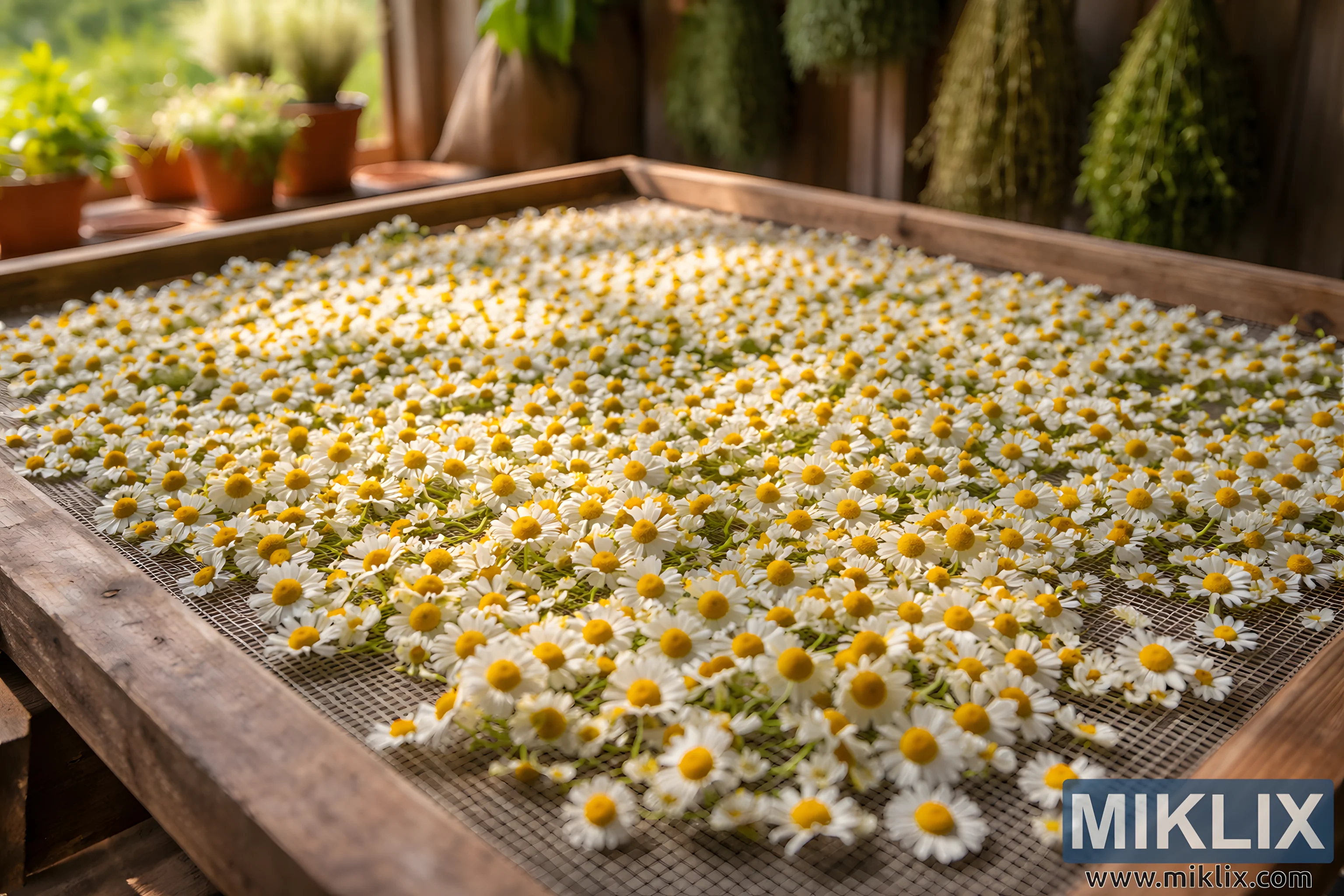 This image communicates themes of herbal tradition, small-scale agriculture, and natural processing methods. It evokes the sensory experience of drying herbs: the faint sweetness of chamomile in the air, the gentle warmth of sunlight, and the quiet stillness of a space designed for patience and attention. The photograph feels both practical and aesthetic, blending functionality with a timeless, artisanal mood that highlights the simplicity and beauty of working with plants in their raw, natural form.