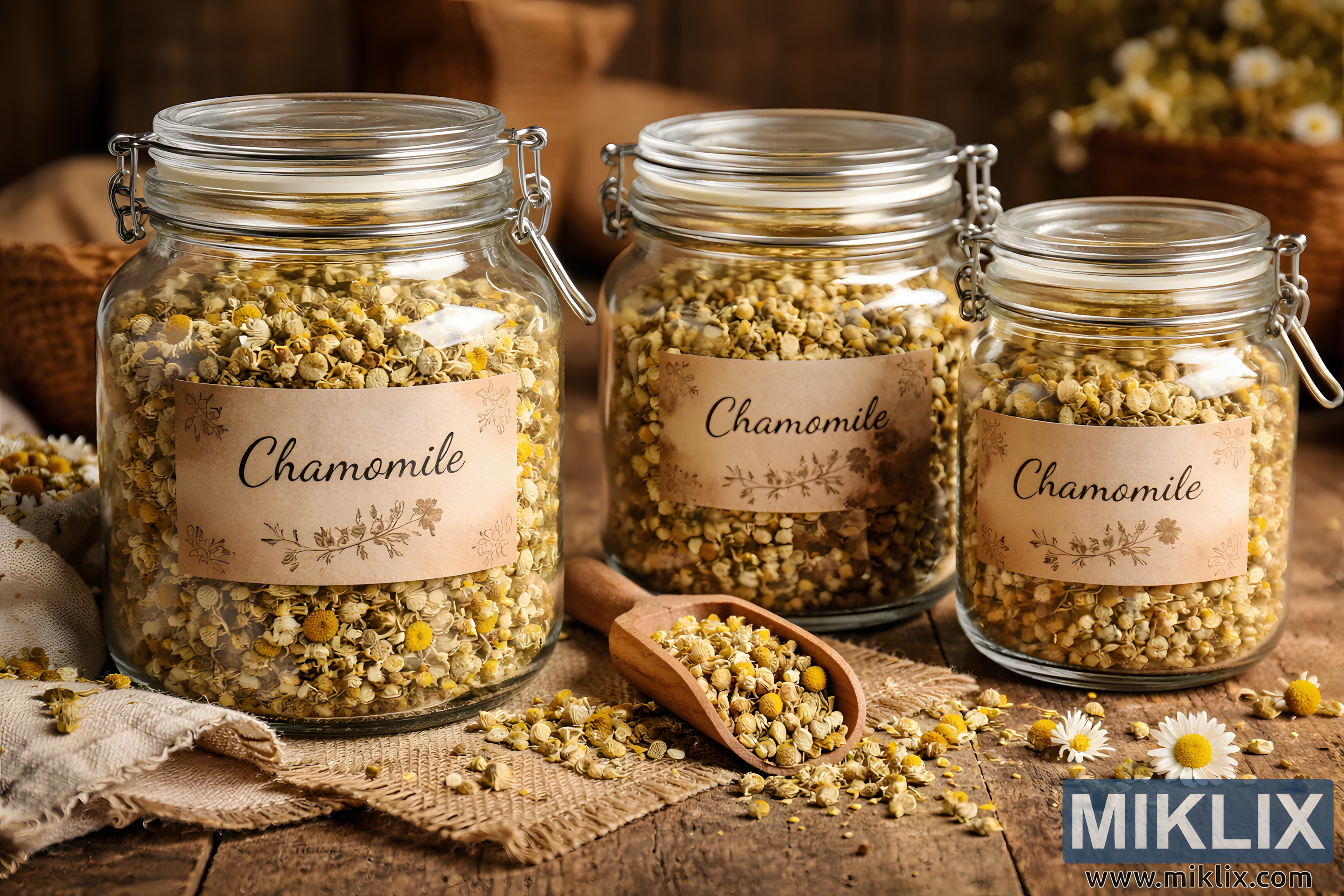 Image: Dried Chamomile Flowers in Labeled Glass Jars