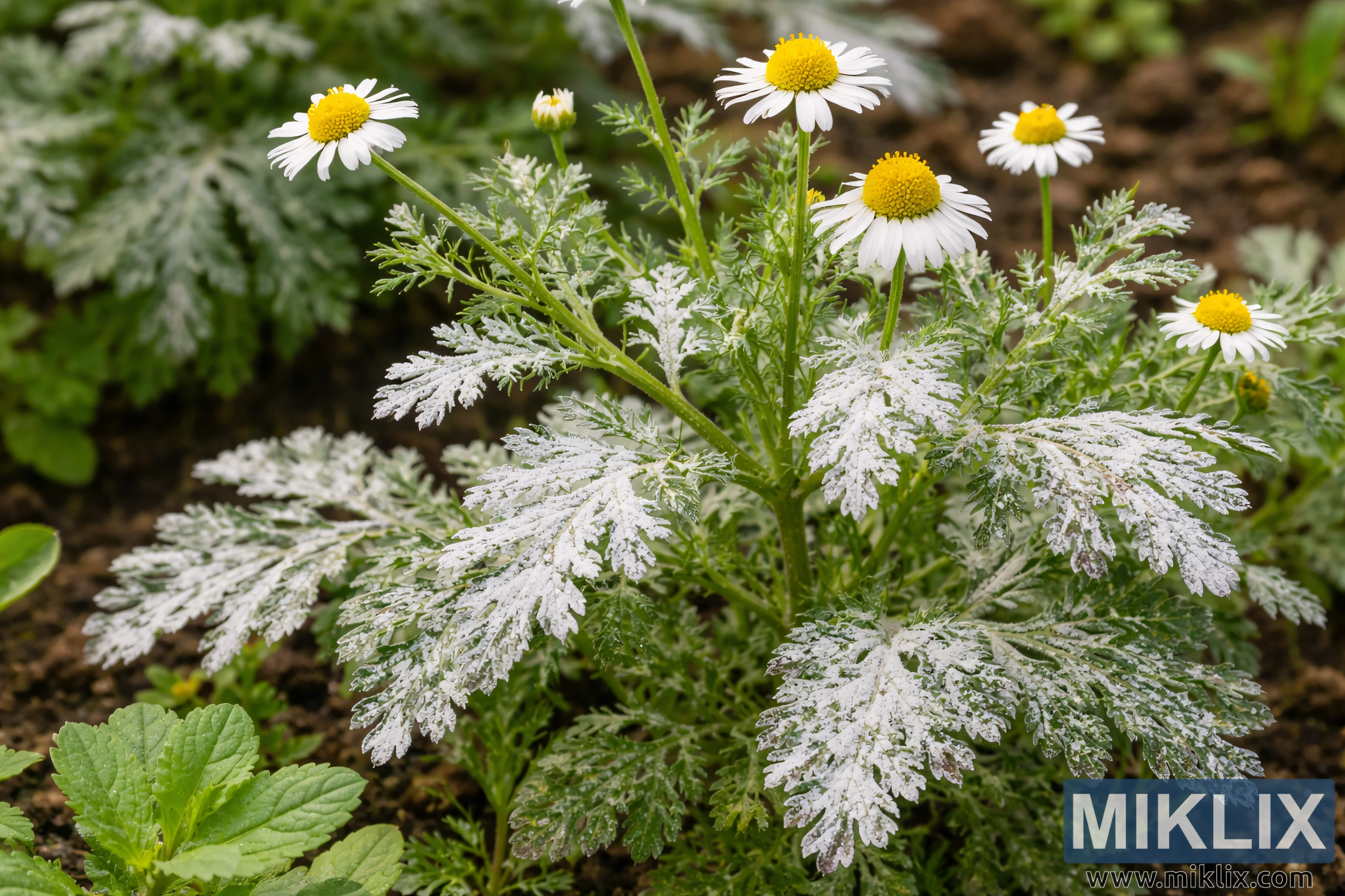 High-resolution photo of a chamomile plant showing powdery mildew infection, with white fungal coating on leaves and blooming flowers