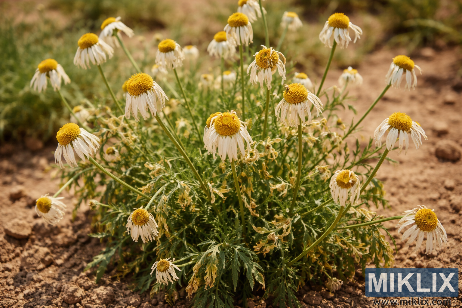 Landscape photograph of a chamomile plant suffering from heat stress, with wilting flowers, yellowing foliage, and dry, cracked soil under intense sunlight.