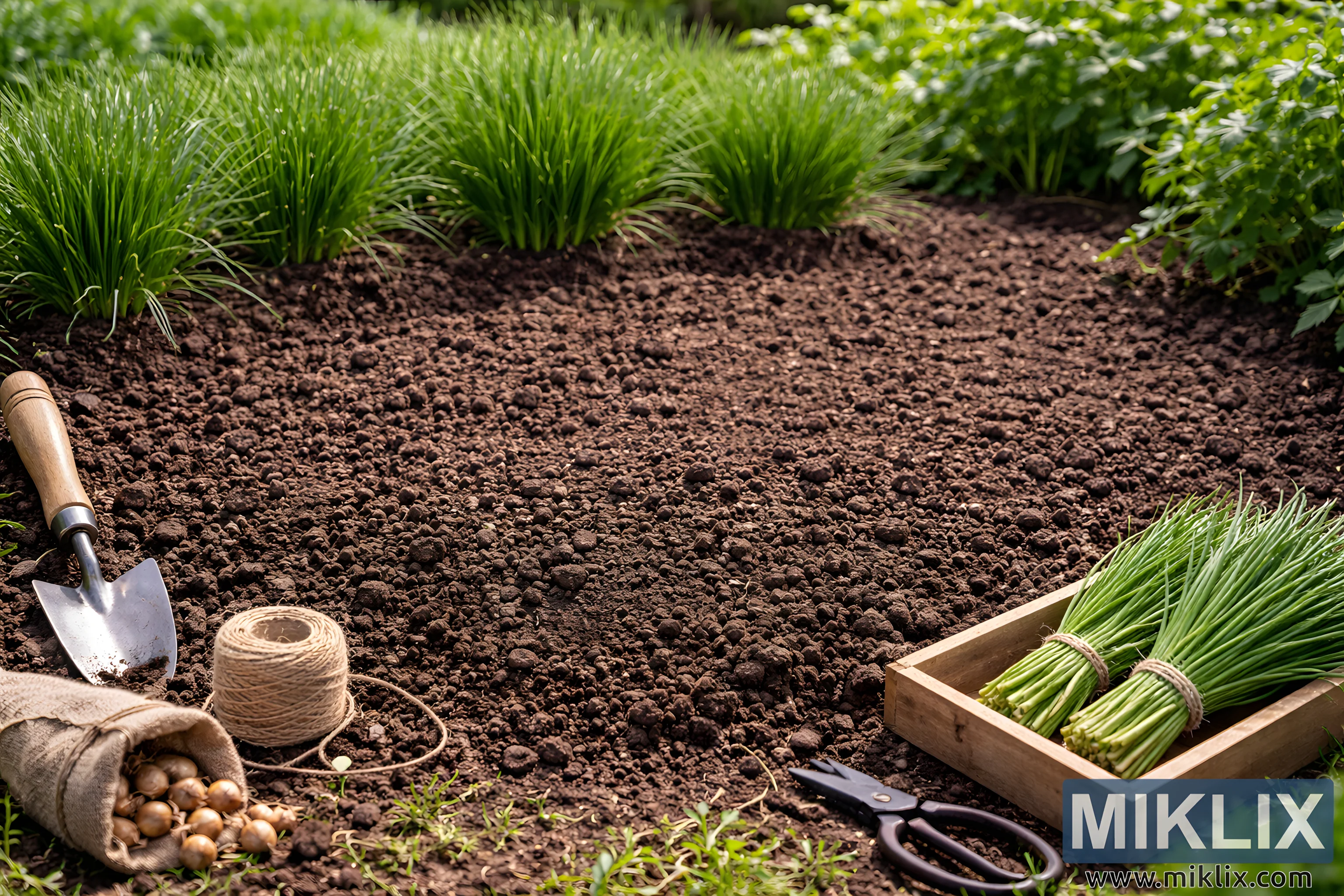 The image presents a carefully prepared garden bed intended for growing chives, shown in a wide, landscape-oriented composition that emphasizes texture, readiness, and calm order. The soil dominates the center of the frame, appearing dark, rich, and finely tilled, with small, evenly distributed clumps that suggest good aeration and moisture balance. Its surface is smooth yet natural, free of weeds or debris, conveying that the bed has been recently worked and thoughtfully prepared for planting. Along the upper edge of the image, dense clusters of healthy green chive plants form a soft border, their slender, upright leaves catching the light and creating a vivid contrast against the deep brown soil. These established plants visually reinforce the purpose of the bed and suggest successful growth under similar conditions. In the foreground, a selection of gardening tools and materials is arranged in a natural, unforced manner. A metal hand trowel with a wooden handle rests on the soil, its clean blade reflecting light and indicating recent use. Nearby, a coil of natural twine sits neatly, evoking careful spacing and orderly planting. A small burlap sack partially spills round chive bulbs onto the soil, their pale, papery skins and earthy tones reinforcing the sense of authenticity and hands-on gardening. To the right, a simple wooden crate holds freshly harvested chives, bundled together with twine, their vibrant green color and straight stems suggesting freshness and vitality. A pair of garden shears lies close by, positioned as if just set down after trimming. The background fades gently into soft greenery, keeping attention focused on the soil and tools while still situating the scene in a lush garden environment. Overall, the image communicates preparation, abundance, and care, illustrating an ideal planting space that feels practical, organic, and inviting for growing chives.
