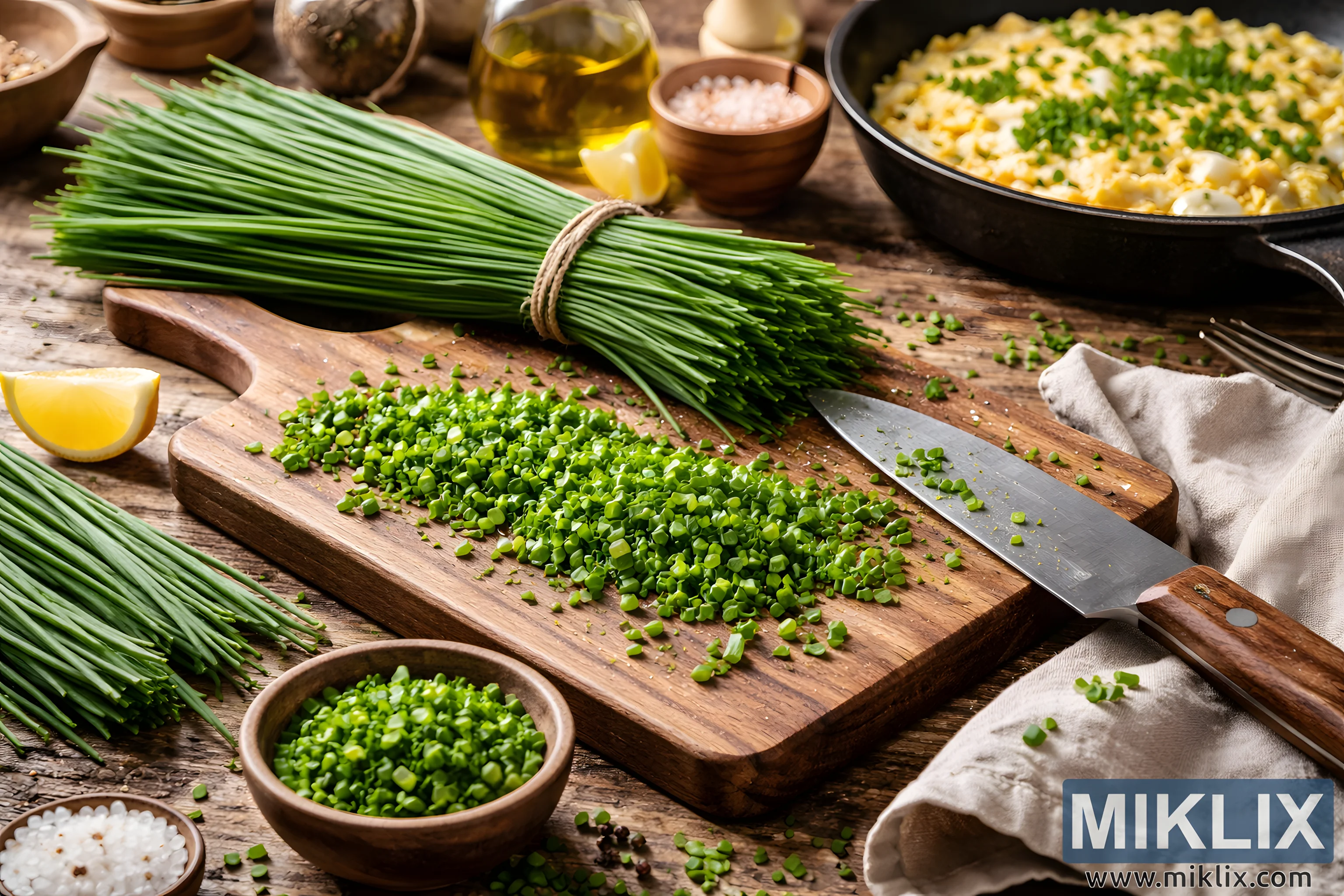 High-resolution photo of freshly harvested chives being chopped and prepared for cooking on a rustic kitchen counter with herbs, knife, and ingredients