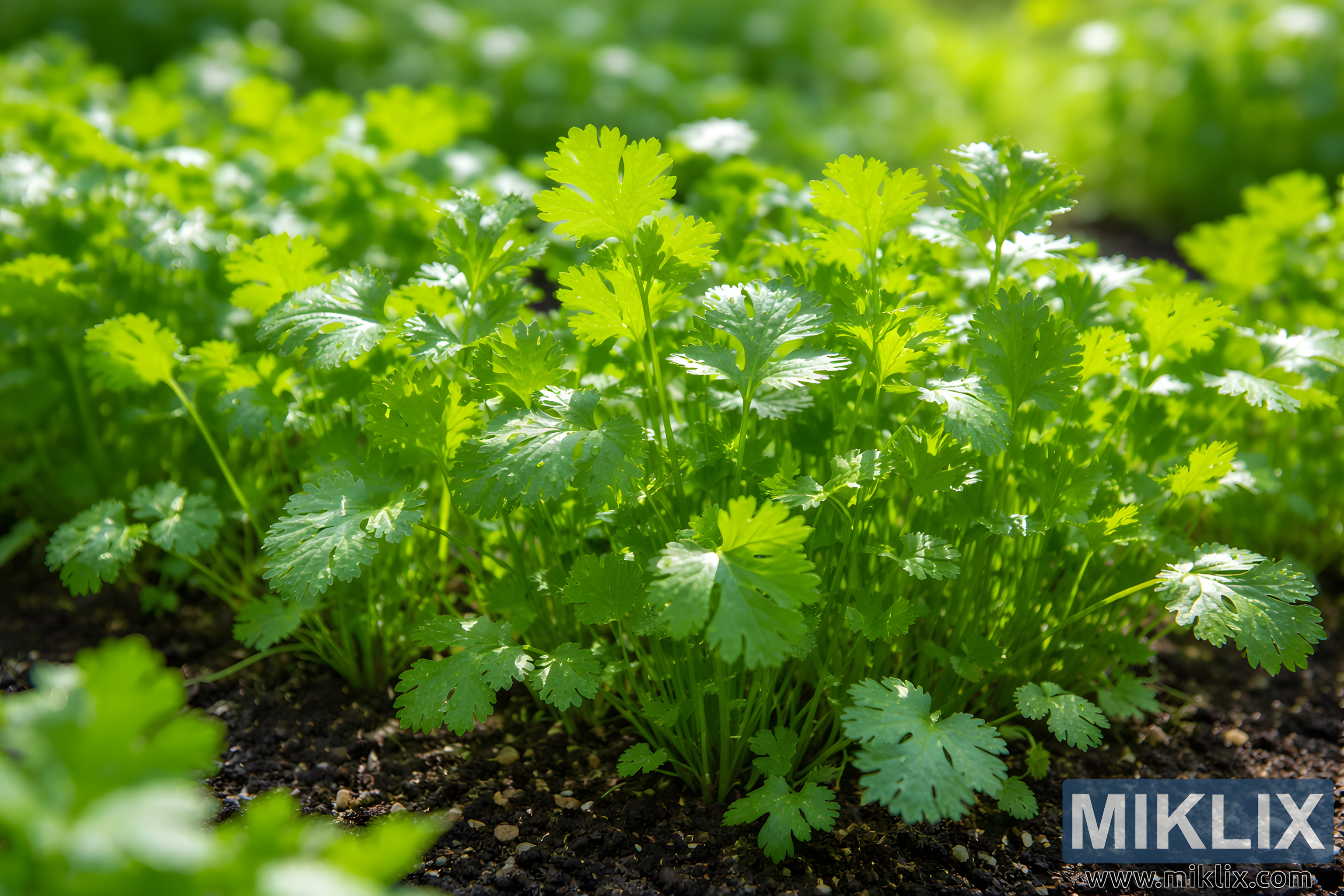 High-resolution image of fresh cilantro growing in a garden, showing vibrant green leaves, moist soil, and natural sunlight, ideal for topics on gardening, herbs, and fresh produce.