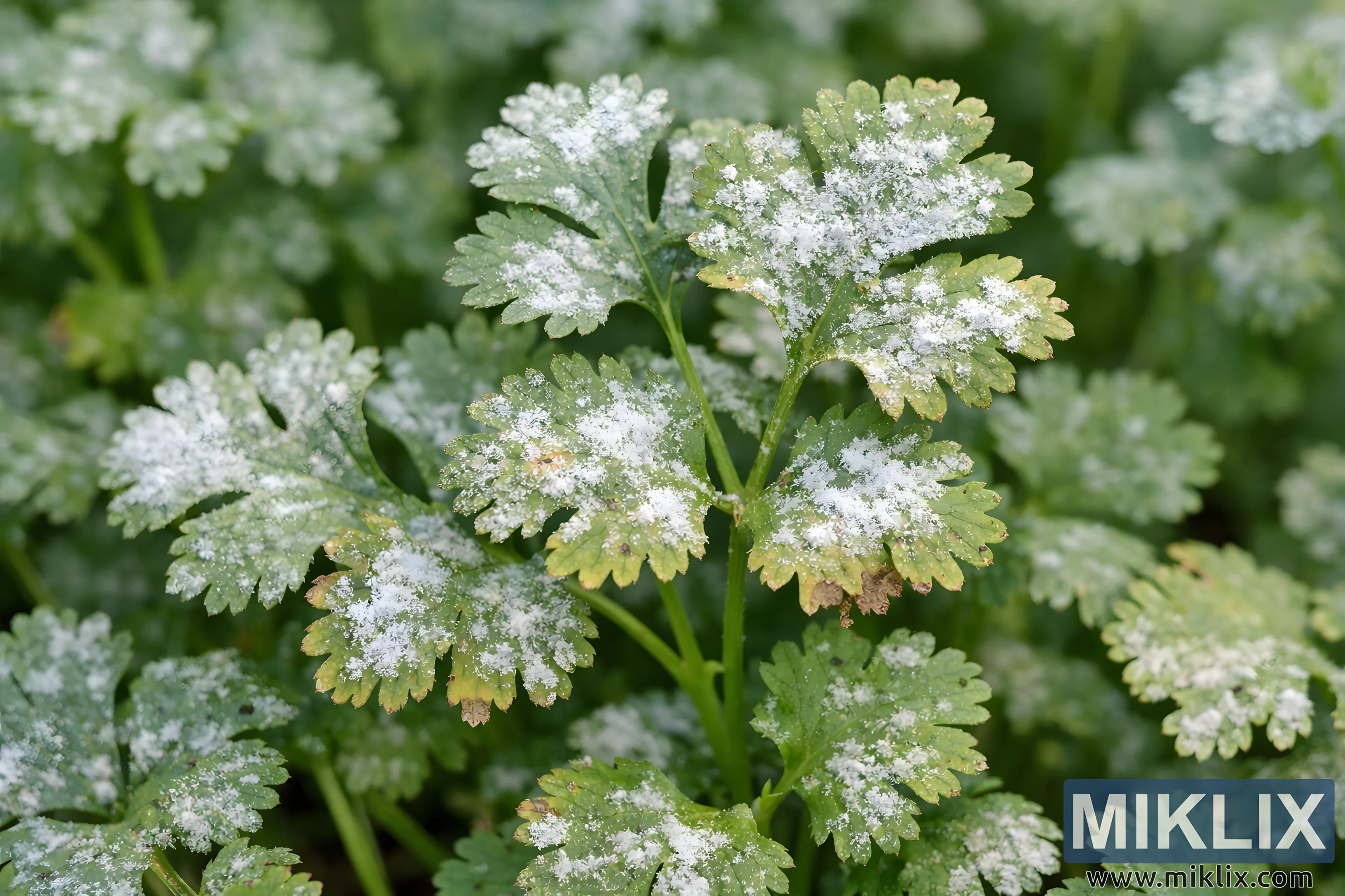 High-resolution close-up photograph of a cilantro plant infected with powdery mildew, showing white fungal patches on green leaves and early signs of plant stress.
