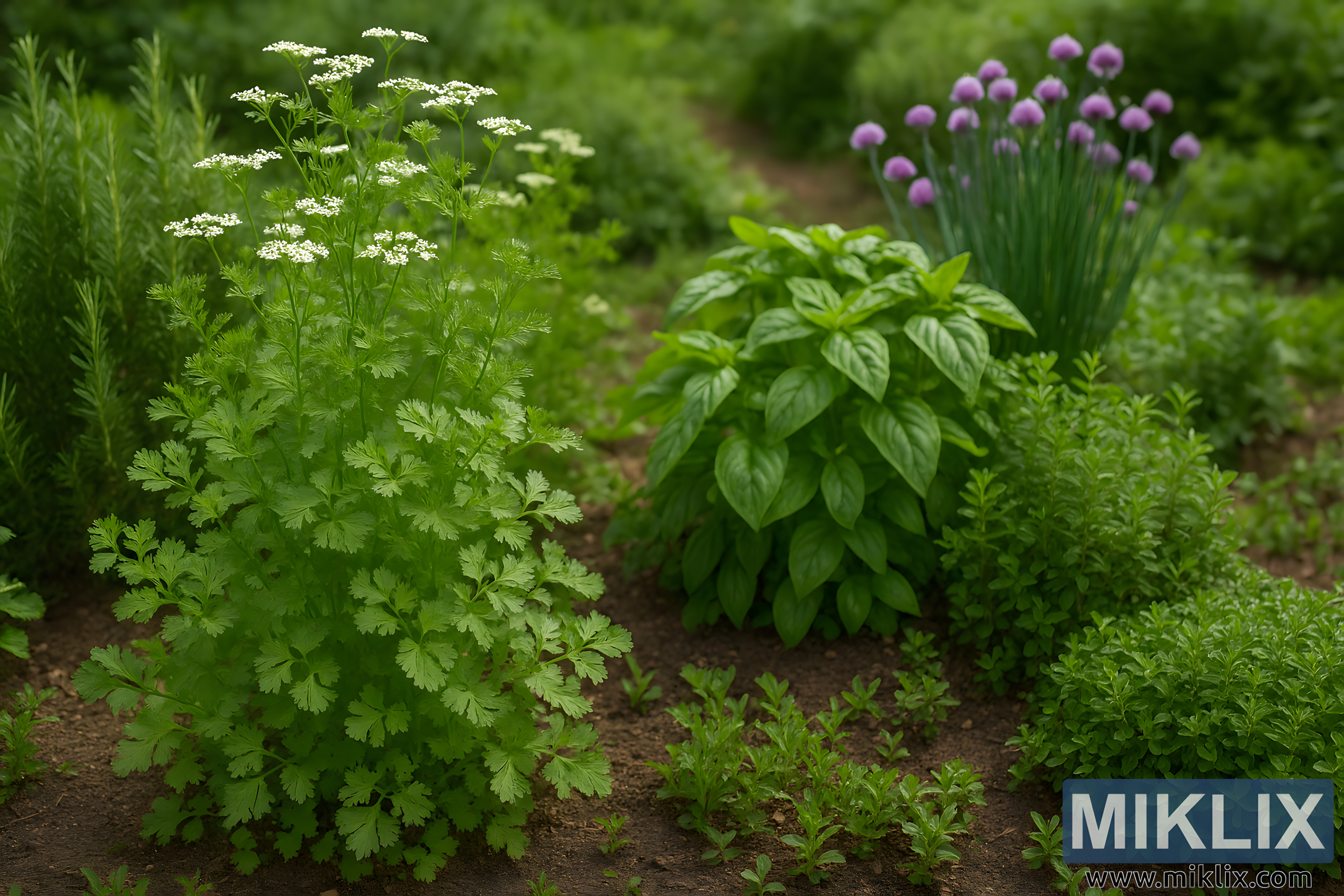 Explore a high-resolution landscape image of a thriving herb garden with mature cilantro, basil, rosemary, chives, and oregano in natural sunlight.