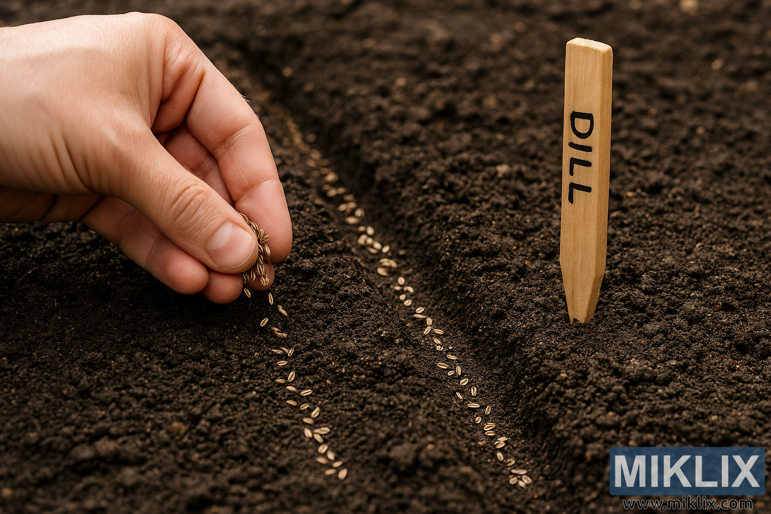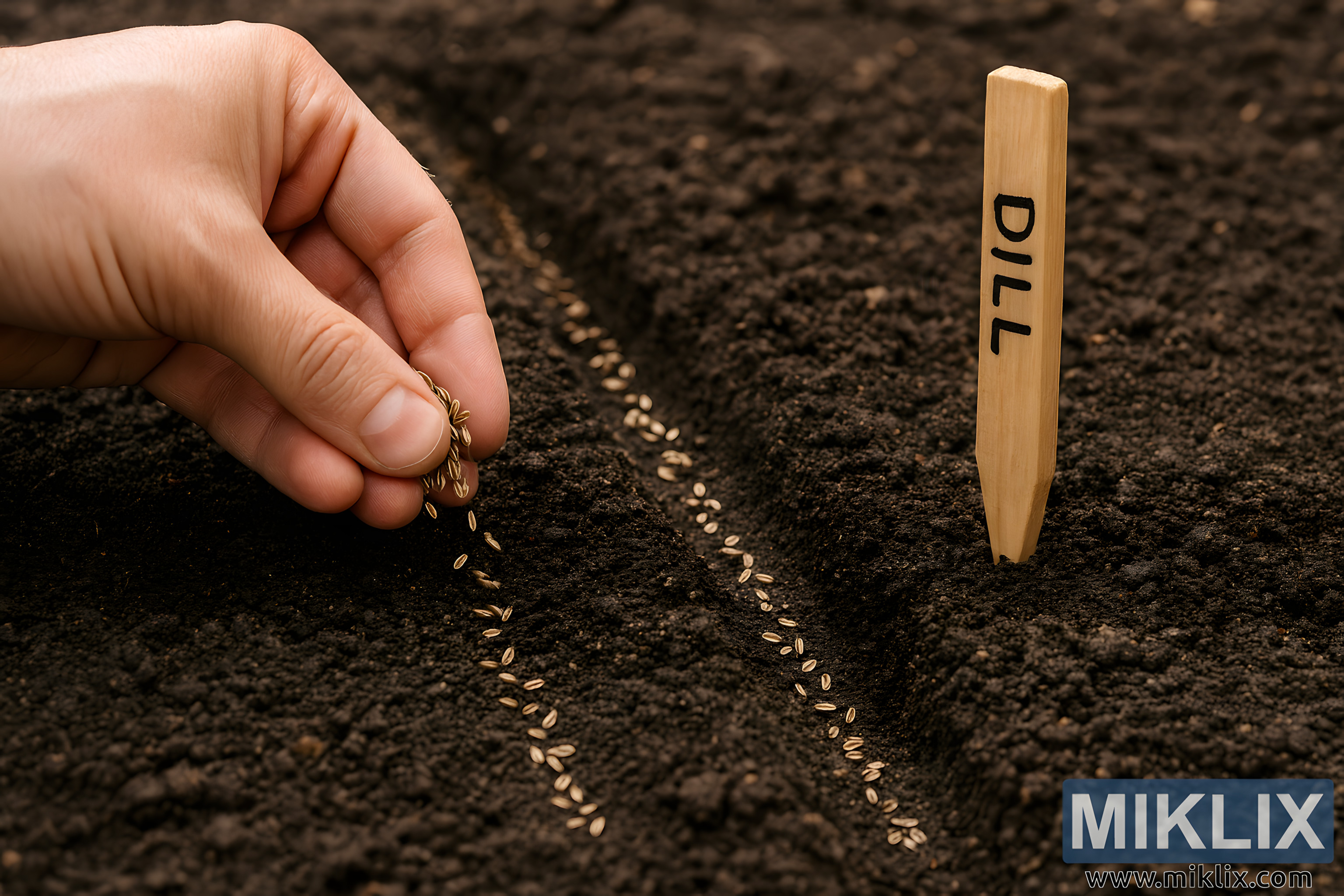 A detailed image showing dill seeds being sown into freshly prepared garden soil with a planting marker, capturing the essence of spring gardening.