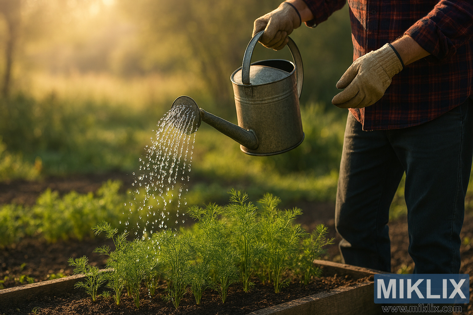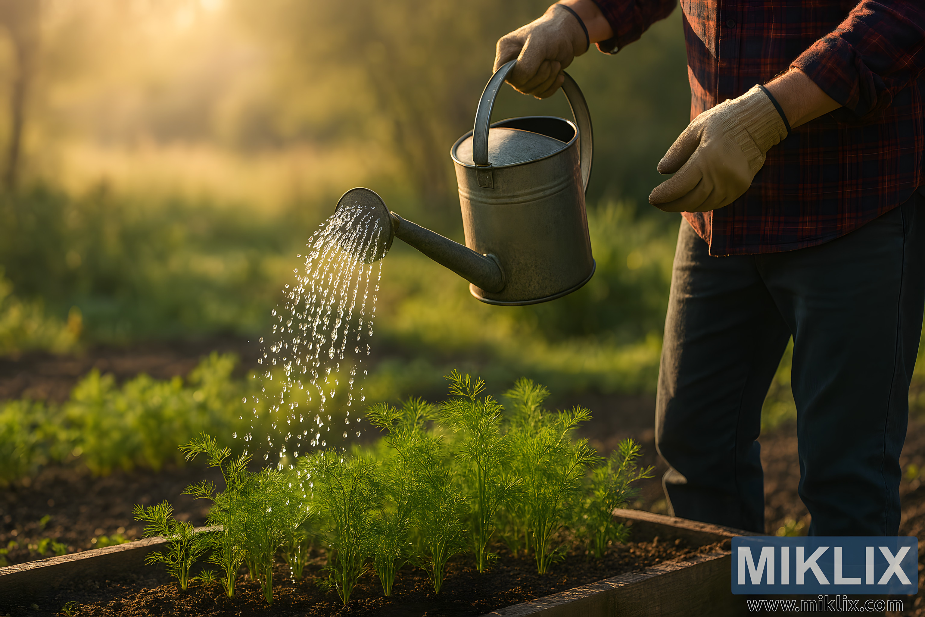 In this tranquil, high-resolution landscape photograph, a gardener is captured mid-action as they water a bed of young dill plants in the soft glow of morning light. The scene is bathed in warm golden hues, with sunlight filtering through the surrounding foliage and casting long, gentle shadows across the rich, dark soil. The gardener, visible from the waist down, wears a red and blue plaid shirt, sturdy dark trousers, and thick beige work gloves. Their left hand grips the curved handle of a vintage-style metal watering can, which has a long spout and a wide, perforated sprinkler head. A graceful arc of water droplets cascades from the can, catching the sunlight and forming a sparkling stream that lands delicately on the feathery green dill leaves below.