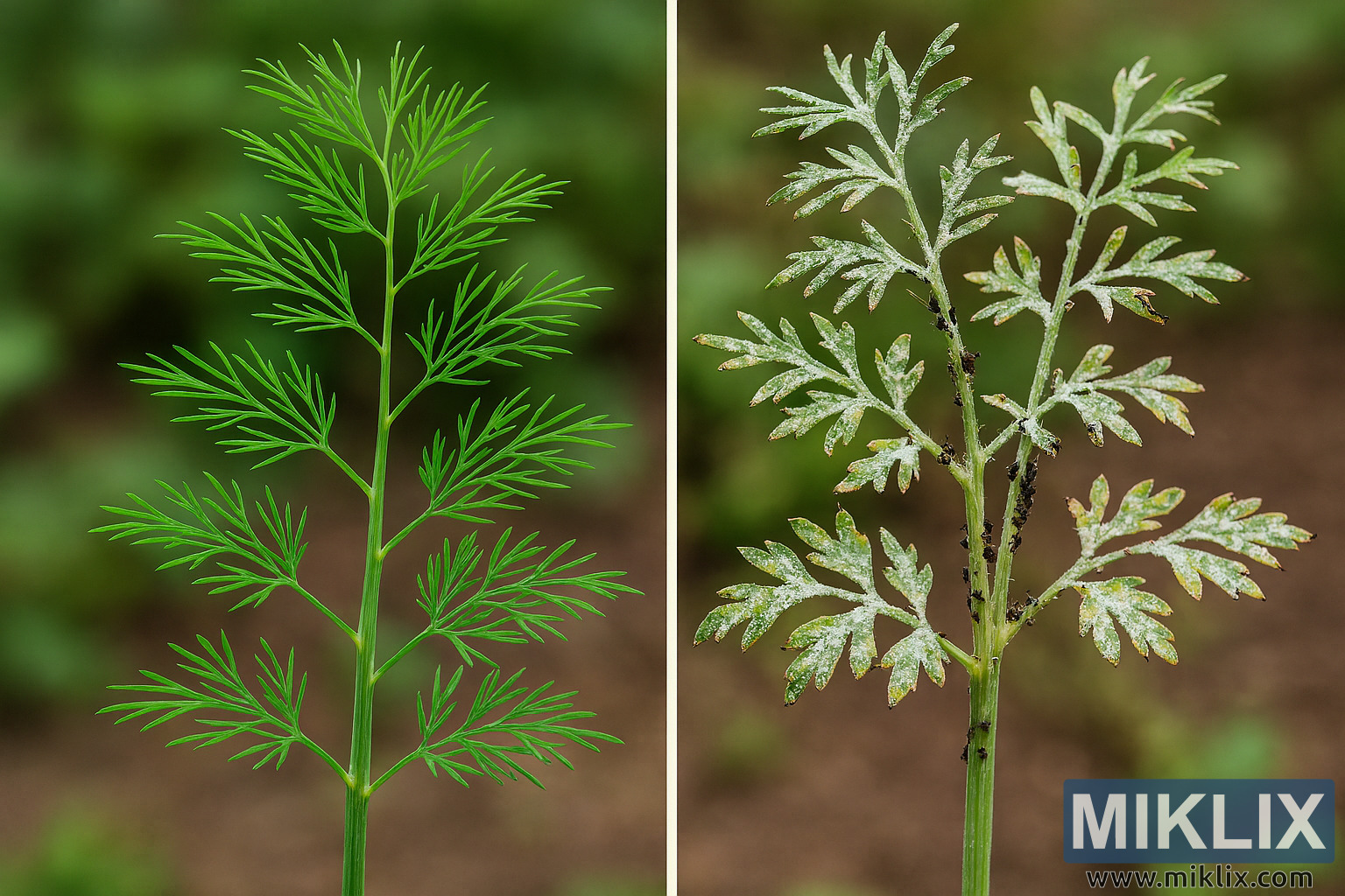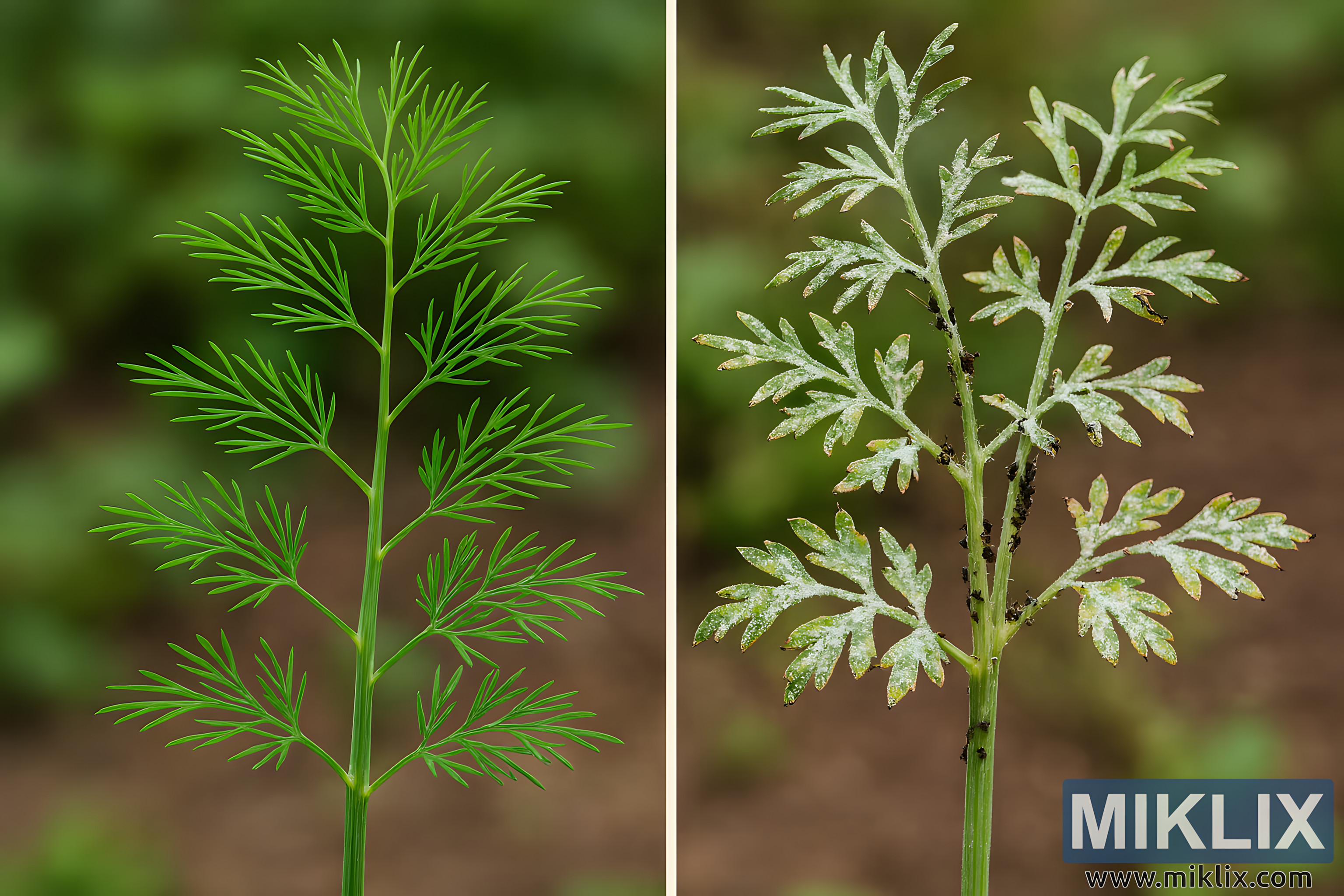 In contrast, the right side of the image features a dill plant visibly affected by aphids and powdery mildew. The central stem, though similarly slender, appears slightly discolored and is speckled with clusters of small, black aphids. These pests are concentrated near the base of the leaflets and along the stem, visibly disrupting the plant’s integrity. The leaves are pale green to yellowish, with many showing signs of curling and wilting. A white, powdery substance—indicative of powdery mildew—is present on the leaf surfaces, particularly on the upper portions. This fungal infection gives the leaves a dusty appearance and contributes to their unhealthy texture and coloration. The overall structure of the plant is less upright and more sparse, with noticeable gaps in the foliage. The background on this side mirrors the left, maintaining consistency in setting and lighting, but the plant’s condition starkly contrasts with its healthy counterpart.