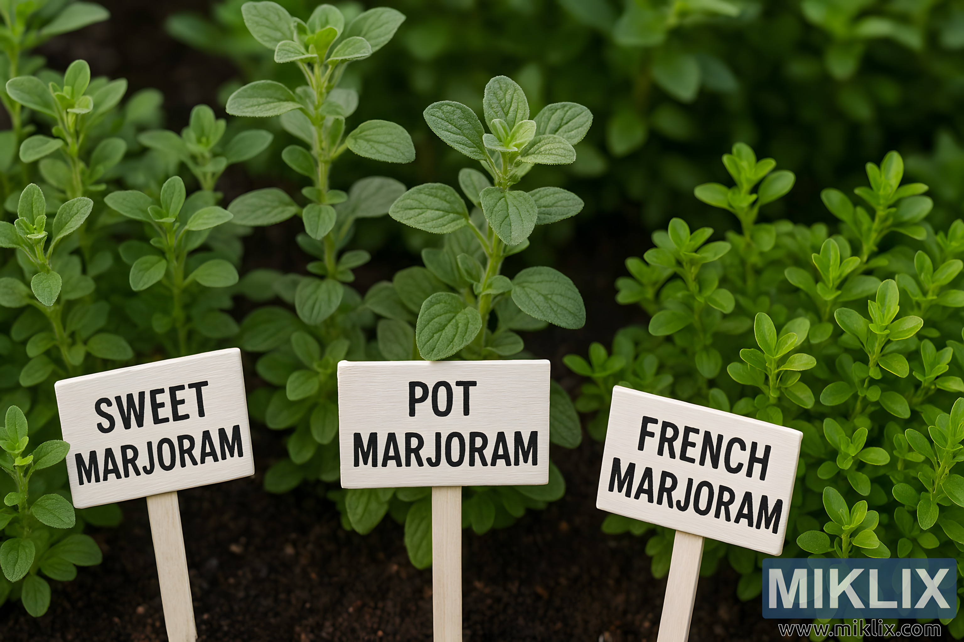 High-resolution image of sweet marjoram, pot marjoram, and French marjoram varieties growing in a garden, each clearly labeled and thriving in rich soil.