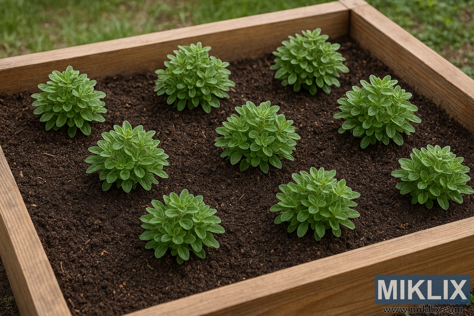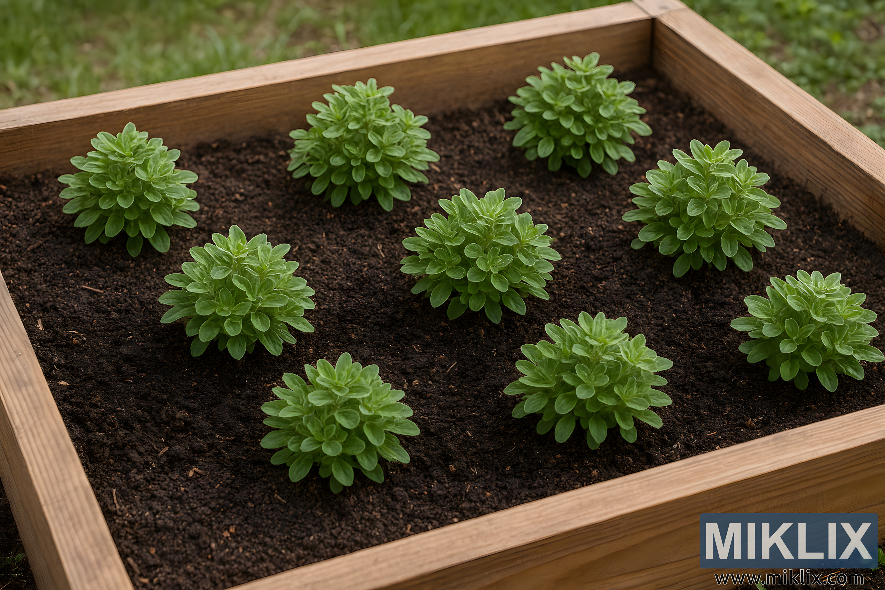 High-resolution landscape photo of healthy marjoram plants evenly spaced in a raised garden bed, showcasing optimal growing conditions.