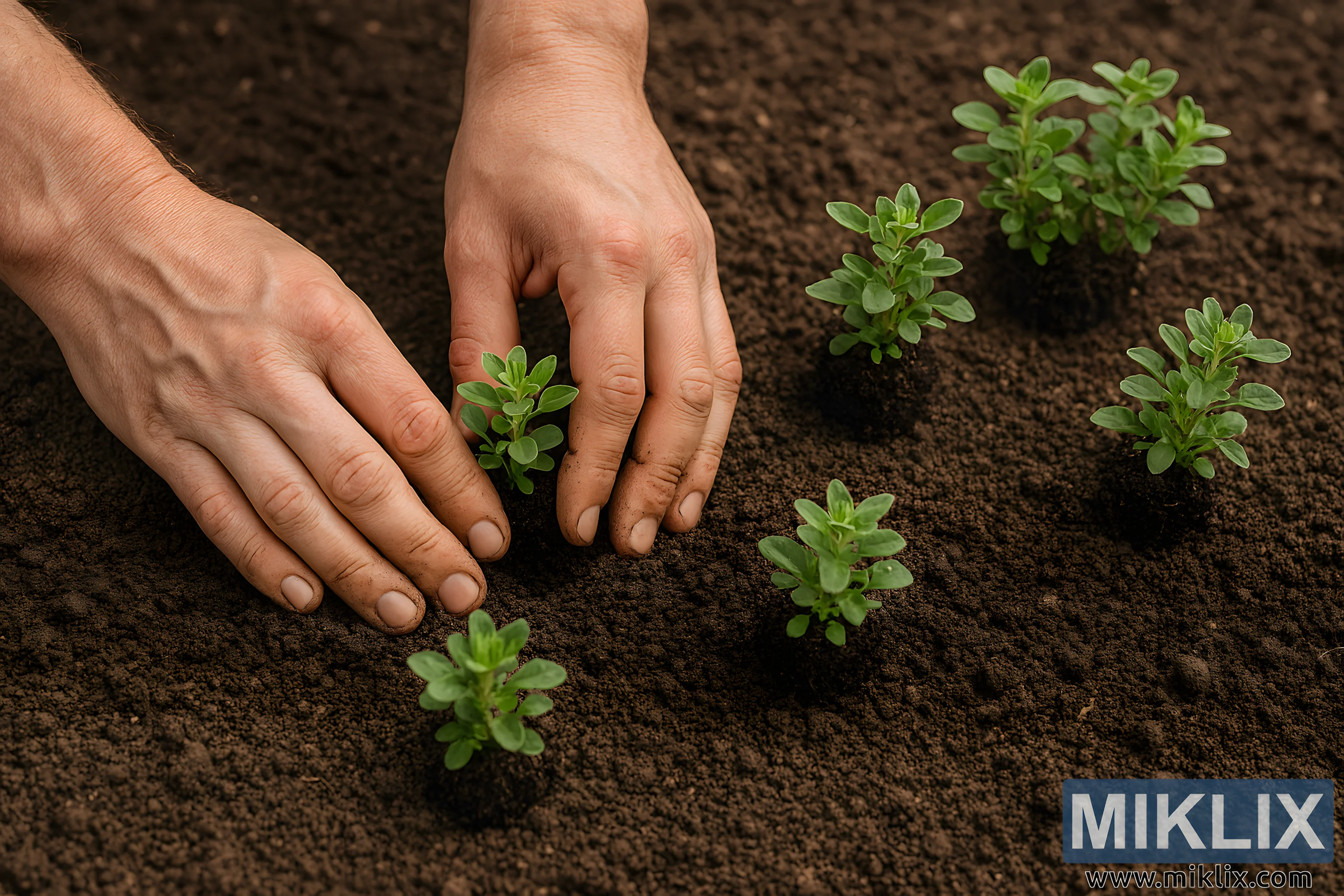 Close-up of hands planting marjoram seedlings in rich garden soil, showing proper spacing and technique.