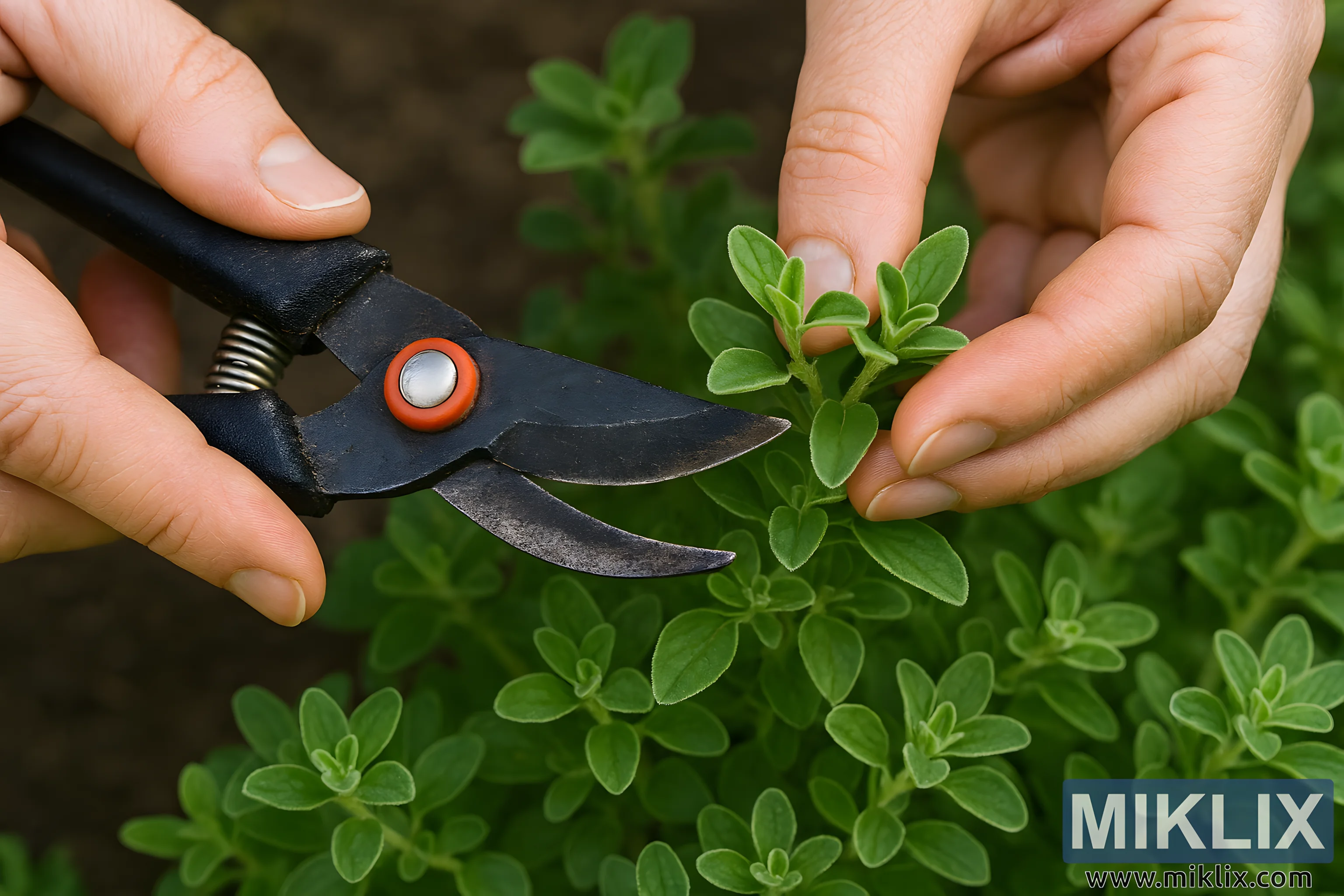 Detailed close-up of hands pruning a marjoram plant to encourage bushy growth, showing shears and vibrant green leaves.