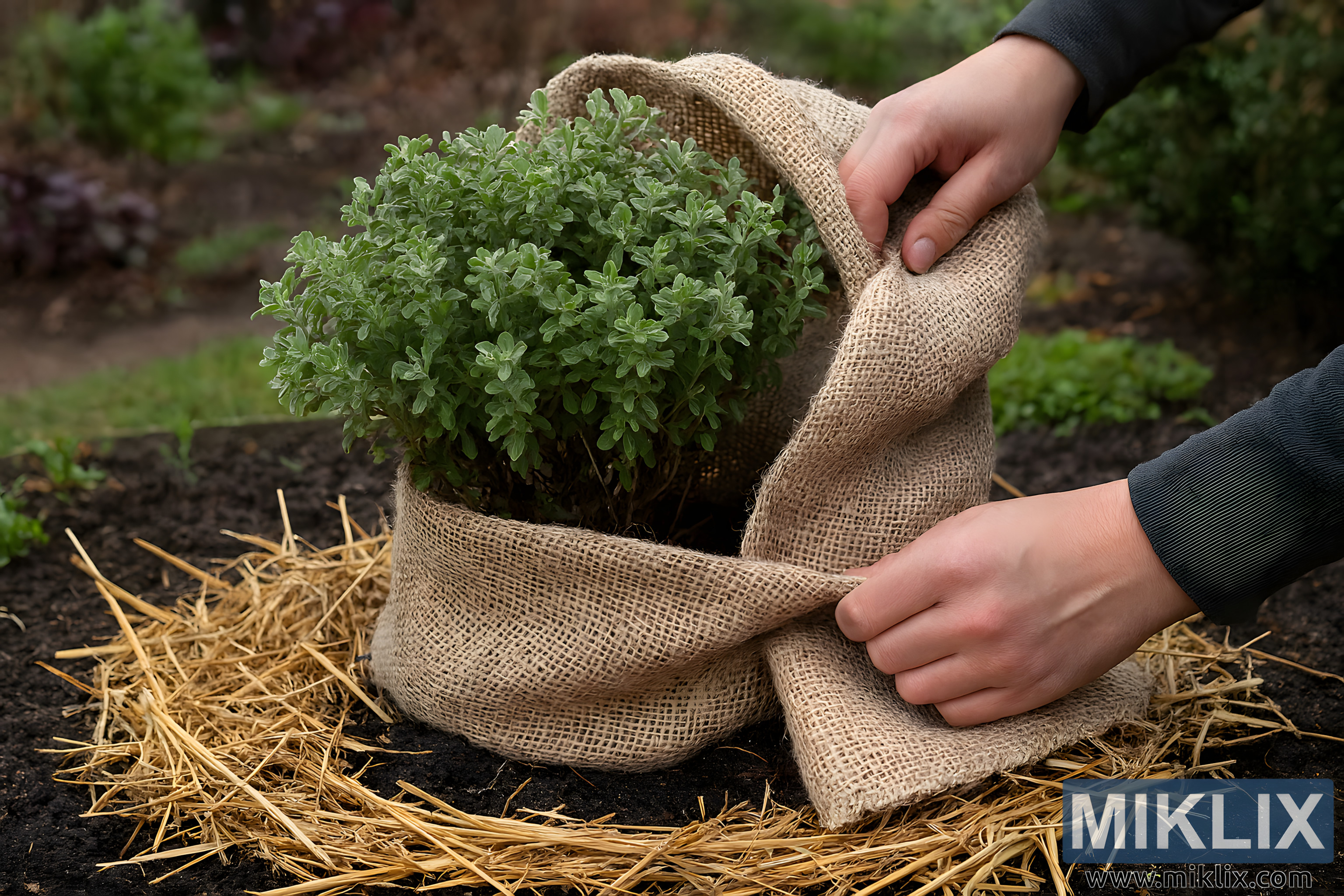A gardener prepares a marjoram plant for winter by wrapping it in burlap and adding straw mulch in a lush garden setting.