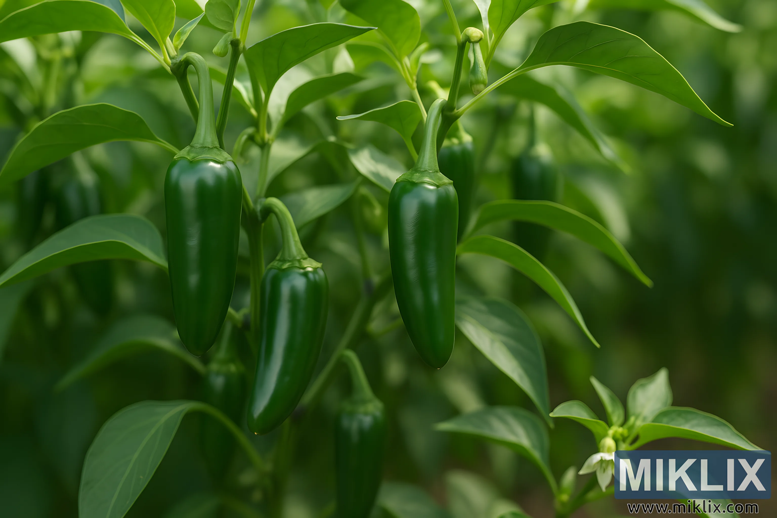 A detailed close-up of jalapeño peppers growing on a healthy plant, showcasing vibrant green pods and foliage.