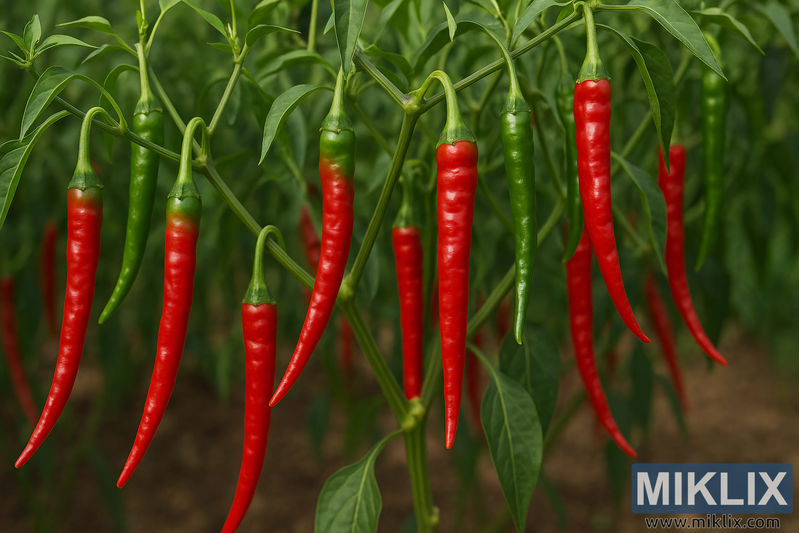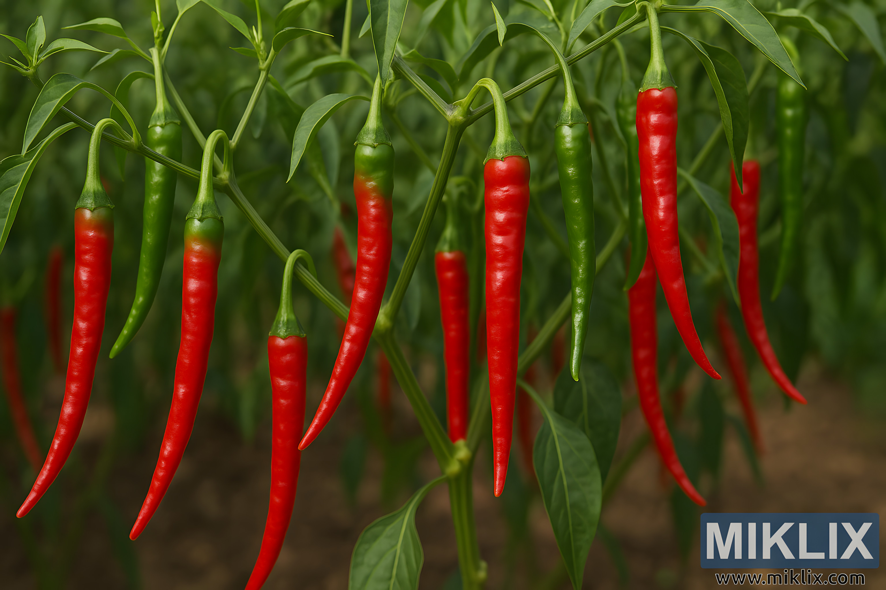 The image depicts a vibrant cluster of long, slender cayenne peppers hanging gracefully from their plants in a lush garden setting. The peppers are in varying stages of ripeness, transitioning from deep green to a vivid, glossy red. Their elongated shapes curve gently downward, and their smooth surfaces reflect soft natural light, emphasizing the texture and ripening gradient across each fruit. The stems connecting the peppers to the plant are thin yet sturdy, branching outward from the central stalks. Surrounding the peppers is a dense backdrop of elongated green leaves, each with a subtle sheen and delicate veining that enhances the organic detail of the scene. The leaves stretch outward in different directions, framing the peppers and contributing to the sense of growth and abundance. In the background, the foliage becomes softly blurred, creating a shallow depth of field that keeps the viewer’s focus sharply on the peppers in the foreground. The soil beneath the plants is only faintly visible, offering a warm brown contrast to the dominant greens and reds above. Overall, the composition captures the natural beauty and agricultural vitality of cayenne peppers at peak ripening, showcasing the striking contrast between the bright red peppers and the lush green surroundings while conveying a sense of freshness, ripeness, and life within the garden environment.