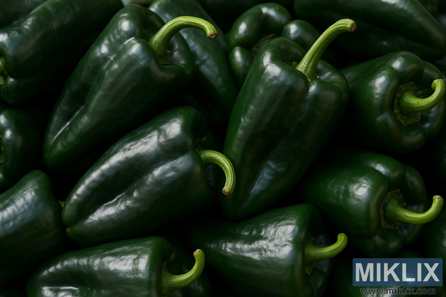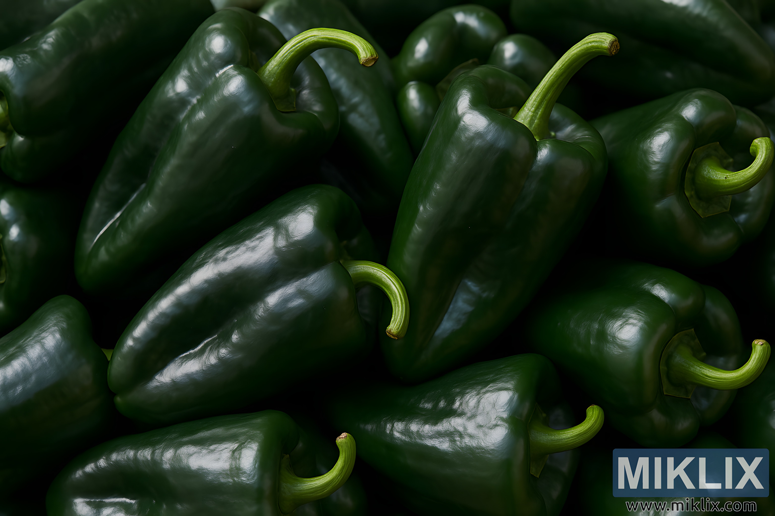 This image presents a richly detailed, high-resolution close-up of a generous pile of large, dark green poblano peppers, arranged naturally so that their shapes overlap and create a sense of abundance. The peppers exhibit the characteristic heart-like form and gently tapered bodies typical of mature poblanos, making them especially well-suited for stuffing. Their surfaces display a glossy sheen that reflects the soft, diffused lighting, revealing subtle textural qualities—slight ripples, gentle indentations, and natural curvature along the pepper walls. Some peppers rest on their sides, while others angle upward or nestle partially beneath their neighbors, giving the arrangement an organic, market-fresh realism. The stems, uniformly green and firm, curve gracefully away from the bodies of the peppers, adding visual rhythm and reinforcing their freshness. The deep, almost forest-green coloration of the skins appears consistent across the pile, suggesting well-ripened produce. Light highlights trace along the peppers’ contours, emphasizing volume and the natural variance in their shapes. Shadows settle in the recesses where peppers overlap, creating depth without distracting from the rich chromatic intensity of the composition. The overall mood of the image conveys quality, ripeness, and culinary potential—particularly for traditional stuffed pepper dishes where the thick pepper walls, ample internal cavity, and mild flavor of poblanos are desired. With its tight framing, the photograph focuses entirely on the peppers themselves, allowing the viewer to appreciate the subtle interplay of light, color, and texture that defines this ingredient’s visual appeal. The resulting still life feels both practical and inviting, as if captured in a produce market or kitchen setting where fresh poblano peppers are ready to be selected, prepared, and transformed into flavorful meals.