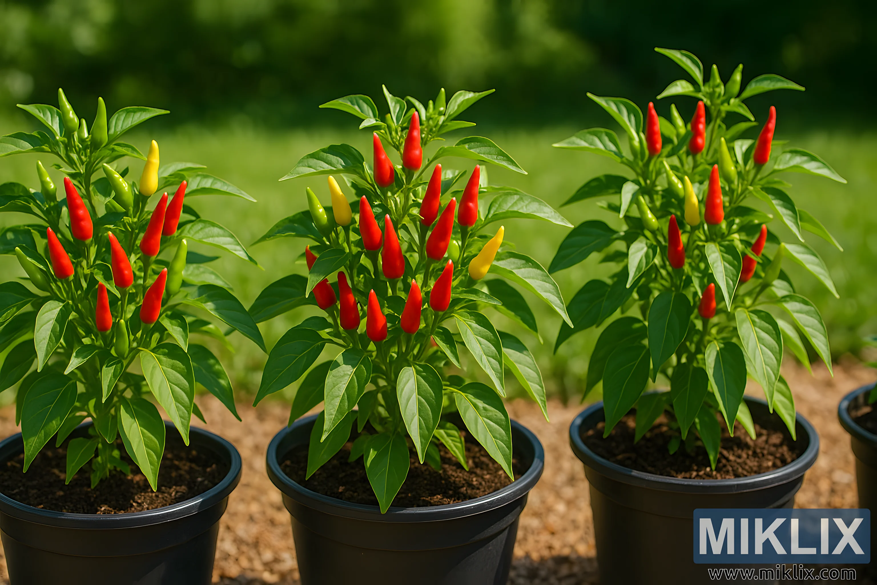 A vivid outdoor photo of healthy chili pepper plants growing in containers, displaying colorful peppers and lush foliage in bright sunlight.
