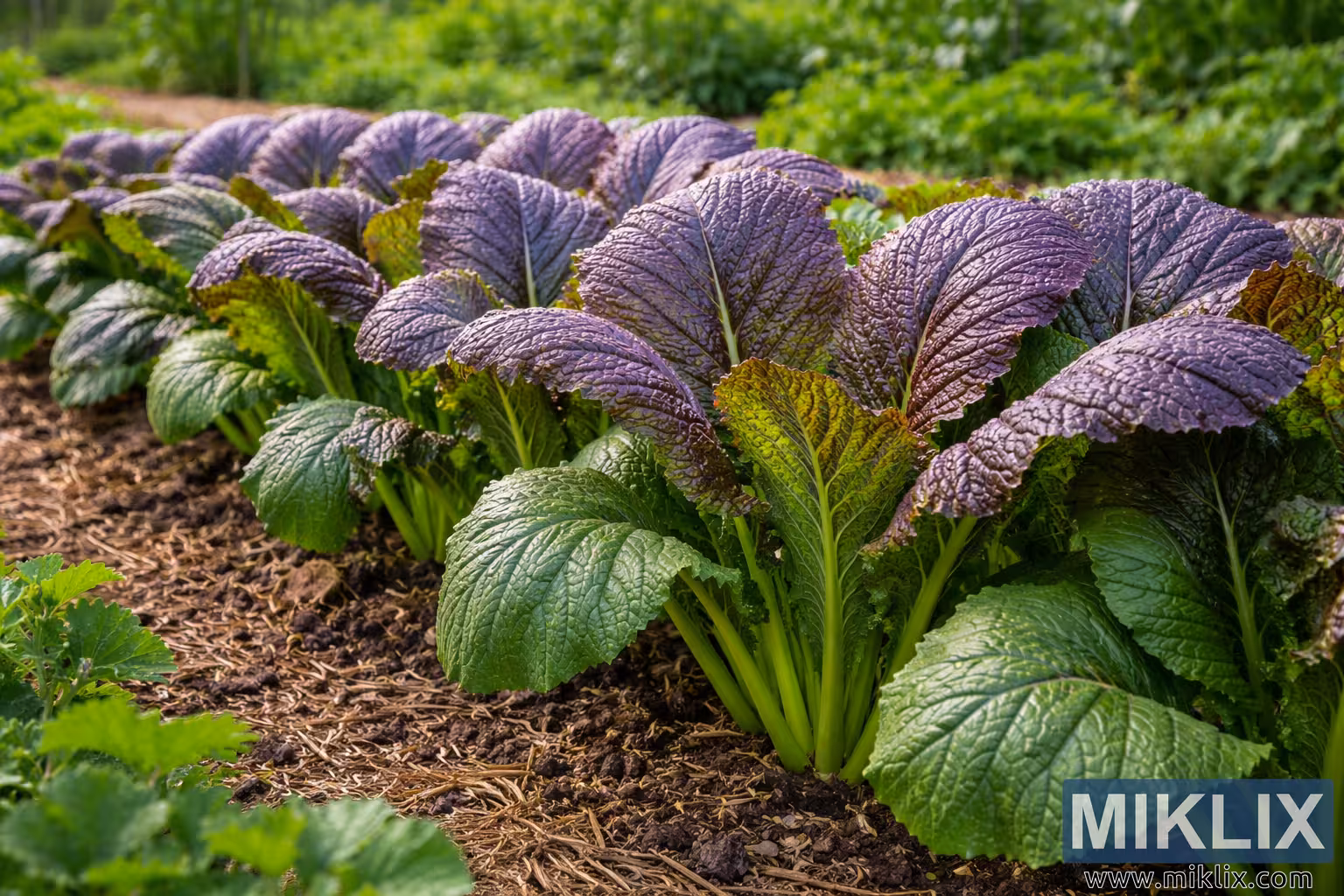 High-resolution landscape photograph of Asian mustard greens with deep green and purple-tinged leaves growing in a neatly mulched vegetable garden.