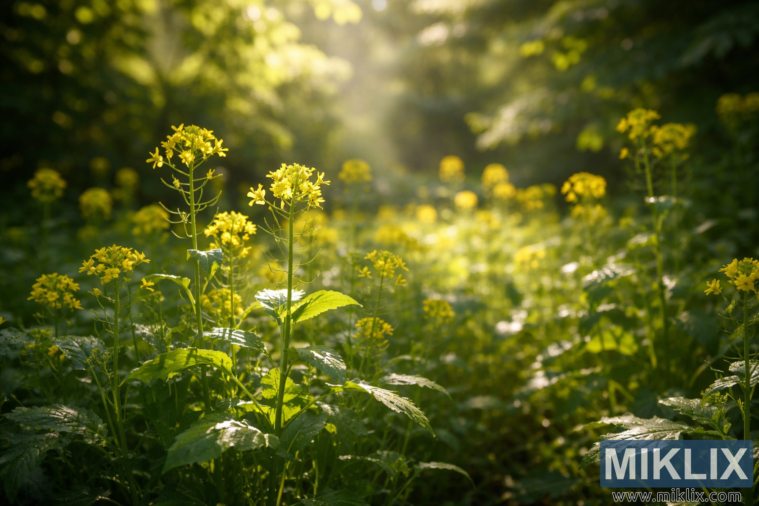 Landscape photo of mustard plants growing in partial shade, featuring vibrant yellow flowers highlighted by dappled sunlight and soft natural greenery.