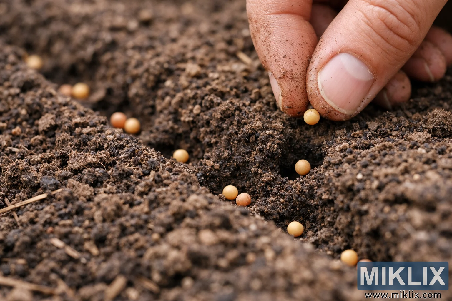 The composition balances clarity and intimacy. The camera’s shallow depth of field keeps the foreground crisp and sharply defined, especially around the fingers and the seed being placed, while allowing the surrounding soil and background to fade gradually into softness. This selective focus underscores the precision involved in proper seed placement and depth control. The image conveys patience, care, and agricultural mindfulness, capturing a quiet, foundational moment in the gardening process.