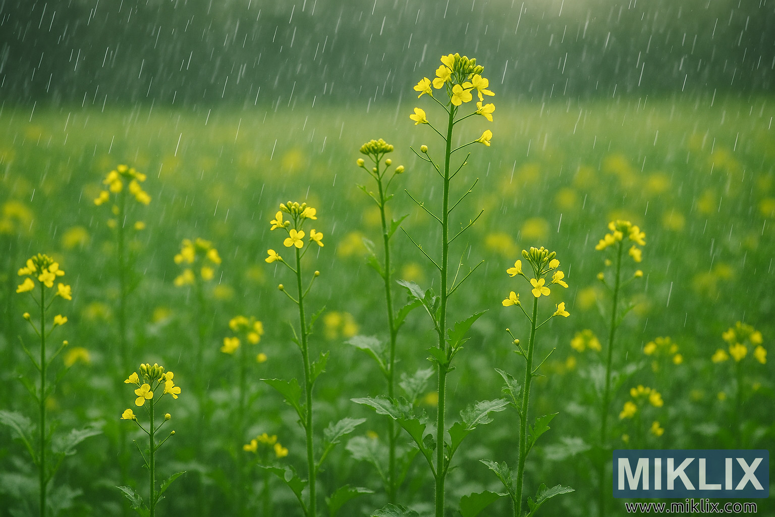 A vibrant field of mustard plants in full bloom under falling rain, captured in natural daylight.