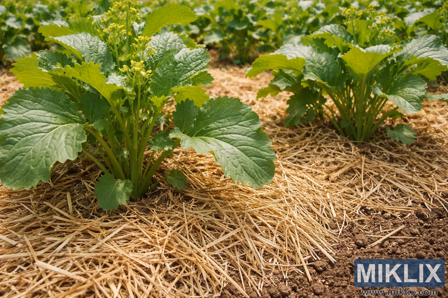 Close-up landscape photo of mustard plants thriving in a vegetable garden, surrounded by straw mulch that helps retain moisture and protect the soil.
