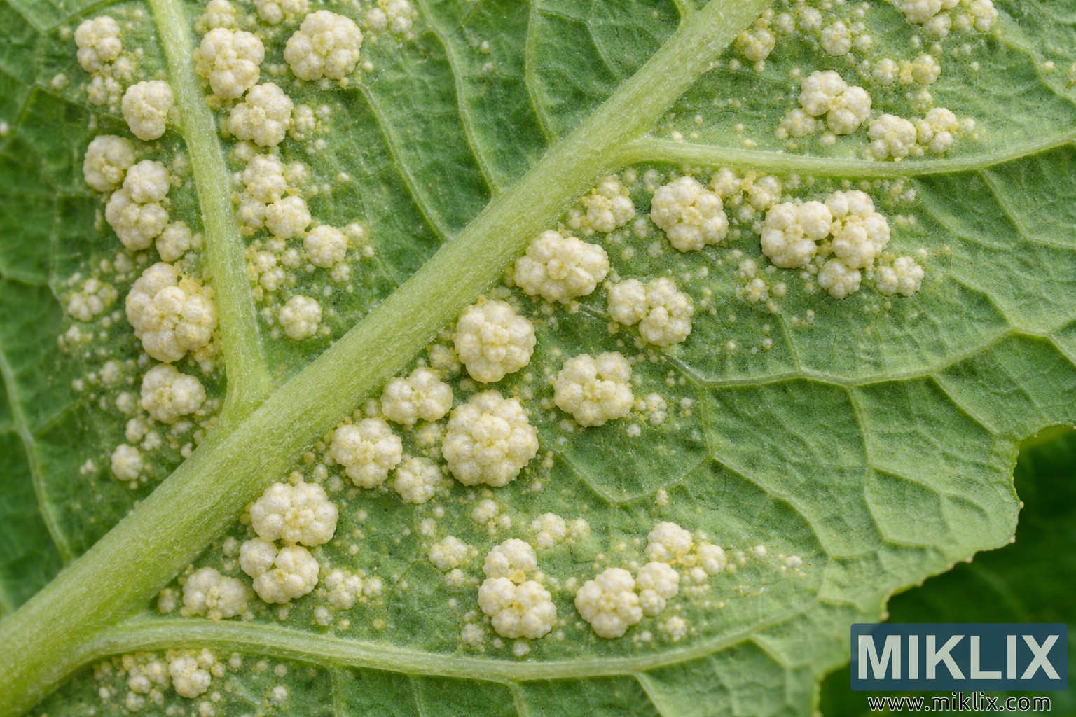 This high-resolution landscape macro photograph captures the underside of a mustard leaf in vivid detail, revealing an extensive outbreak of white rust disease. The green leaf surface fills the frame diagonally, with prominent pale green veins branching outward like a network of raised ribs. Clustered densely along these veins and scattered between them are numerous creamy white pustules of varying sizes. Each pustule appears slightly raised and rounded, with a textured, cauliflower-like surface that suggests tightly packed spore masses beneath a delicate epidermal layer. Some pustules are small and bead-like, while others have expanded into larger, irregularly shaped domes that protrude distinctly from the leaf surface.