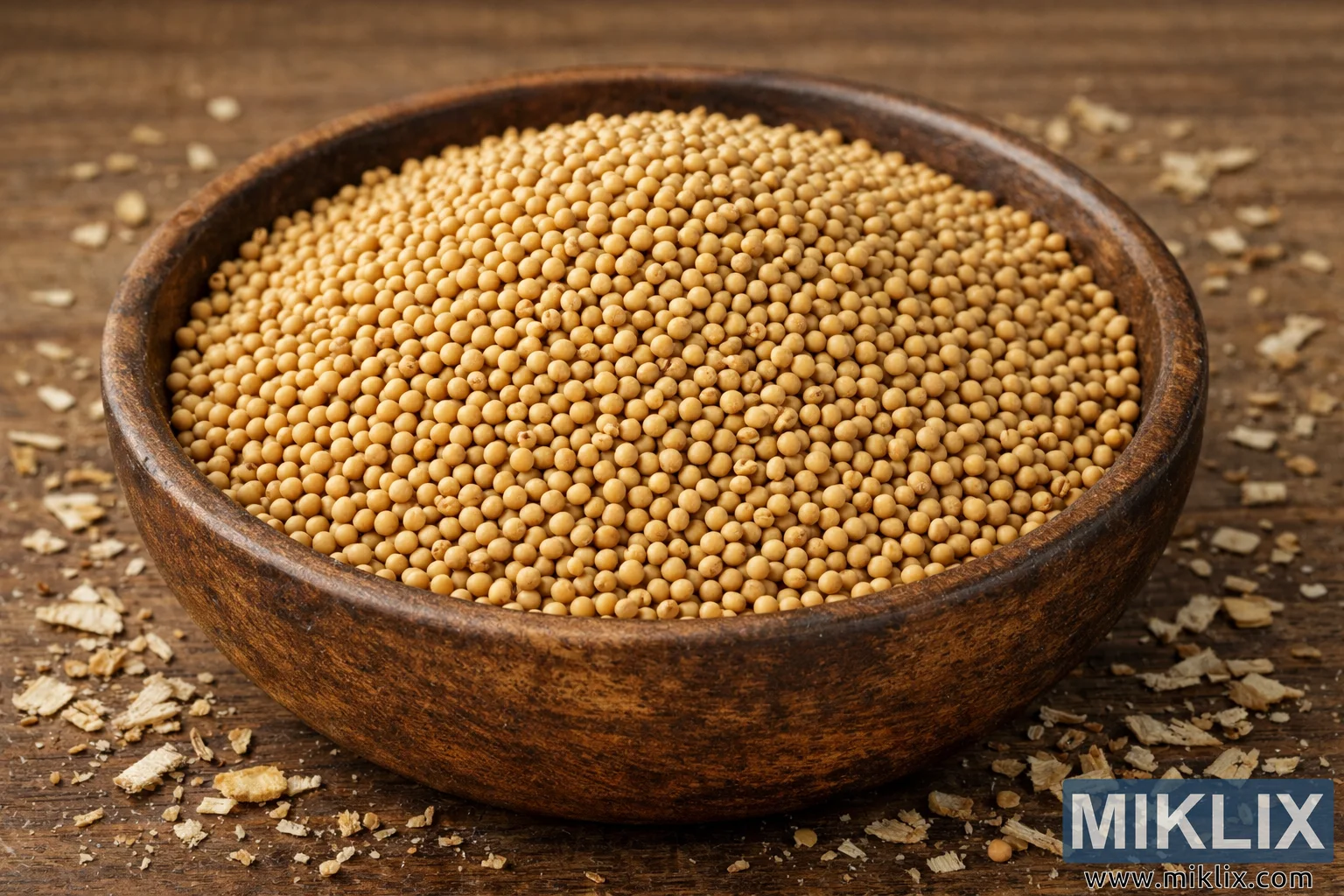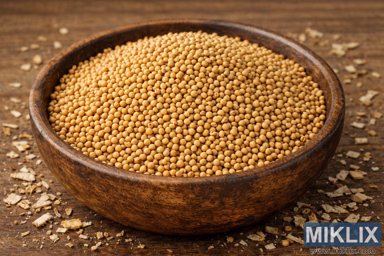 High-resolution landscape image of polished mustard seeds separated from chaff, presented in a rustic wooden bowl on a textured wooden background.