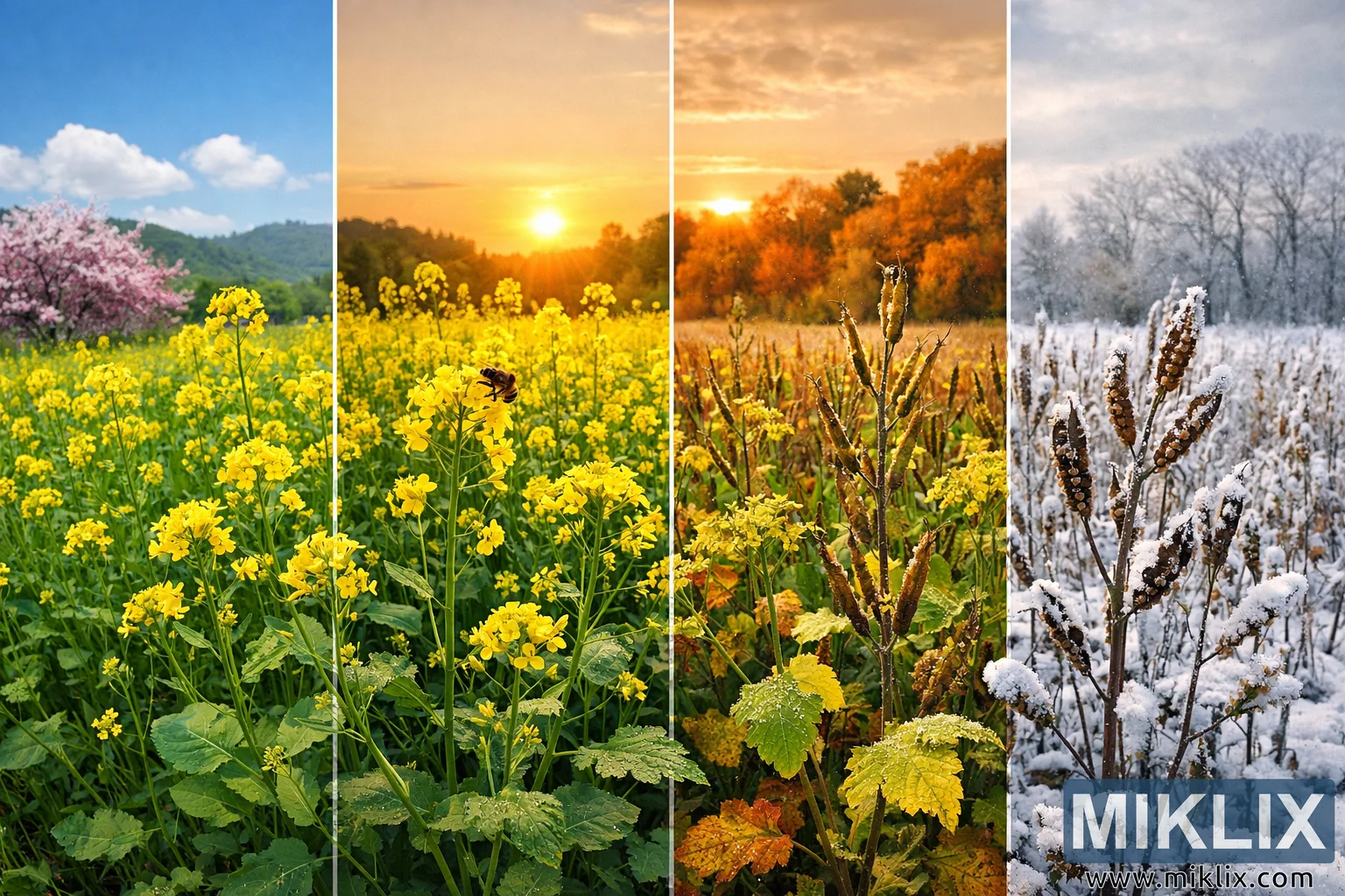 High-resolution landscape collage depicting mustard growing through spring, summer, autumn, and winter, illustrating the plant’s full seasonal life cycle in one panoramic image.