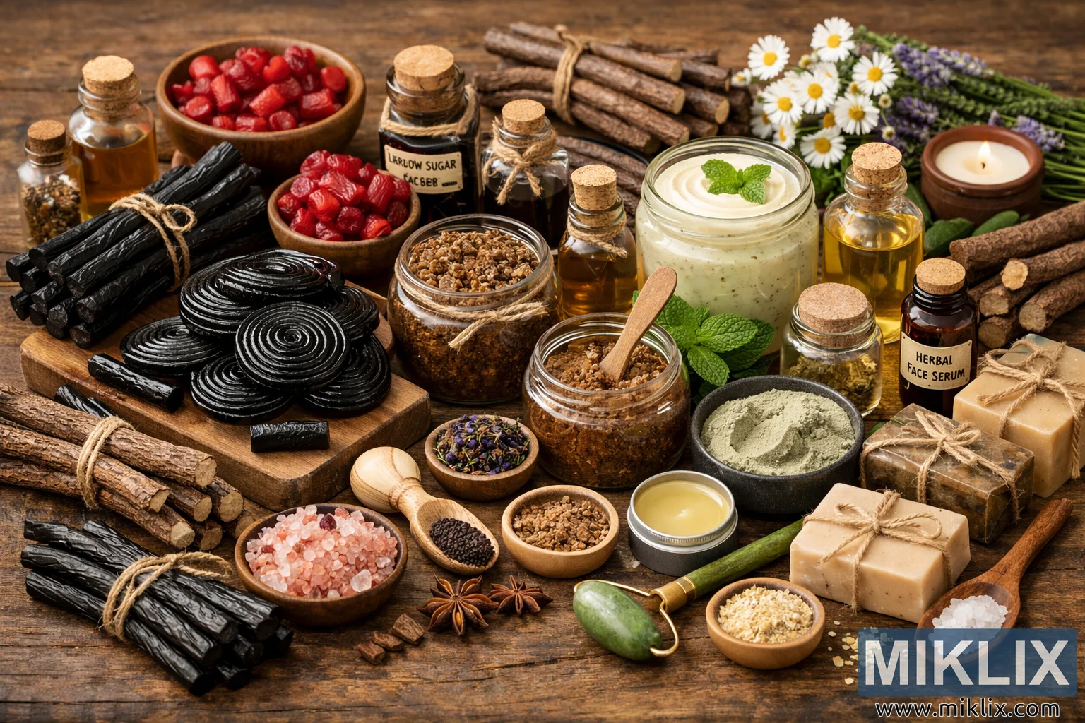 A detailed, landscape-oriented photograph presents a carefully arranged collection of homemade licorice treats and natural beauty products displayed on a rustic wooden table. The scene has a warm, artisanal atmosphere, illuminated by soft natural light that enhances the earthy tones of the wood and the rich colors of the ingredients. At the center and left side of the composition are bundles of glossy black licorice sticks tied together with natural twine. Nearby, coiled licorice wheels and small pieces of candy sit on a wooden cutting board, their shiny surfaces reflecting the gentle light. Small wooden bowls filled with red licorice candies add a contrasting pop of color against the darker tones of the licorice and table. Surrounding the sweets is an assortment of handcrafted beauty products and natural ingredients. Several glass jars contain textured herbal scrubs made from brown sugar and plant-based ingredients, some with small wooden spoons resting inside. A larger glass jar holds a creamy herbal lotion topped with a fresh mint leaf, suggesting soothing, plant-based skincare. Bottles of golden oil sealed with cork stoppers are arranged around the jars, evoking essential oils or botanical extracts. Small containers labeled as herbal serums and natural oils contribute to the handcrafted apothecary aesthetic. The arrangement also includes wrapped bars of handmade soap tied with twine, bowls of mineral salts and powdered clay, and a jade facial roller placed among the products, emphasizing the beauty and self-care theme. Decorative botanical elements appear throughout the scene: sprigs of chamomile flowers, lavender, mint leaves, star anise, and bundles of licorice root sticks scattered across the table. These natural accents reinforce the connection between the edible licorice treats and the plant-based skincare products. The overall composition balances culinary craft with natural wellness, suggesting a creative home workshop where herbal ingredients inspire both sweets and beauty remedies. The image communicates a sense of warmth, craftsmanship, and nature-inspired living, with textures ranging from glossy candy and creamy lotions to coarse scrubs and rustic wood grain, all contributing to a visually rich and inviting still life.
