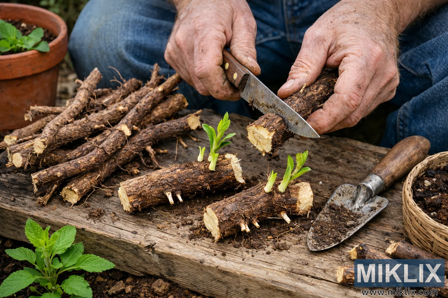 A close-up garden scene showing hands cutting licorice roots into segments for propagation on a rustic wooden workbench with soil, tools, and young green shoots.