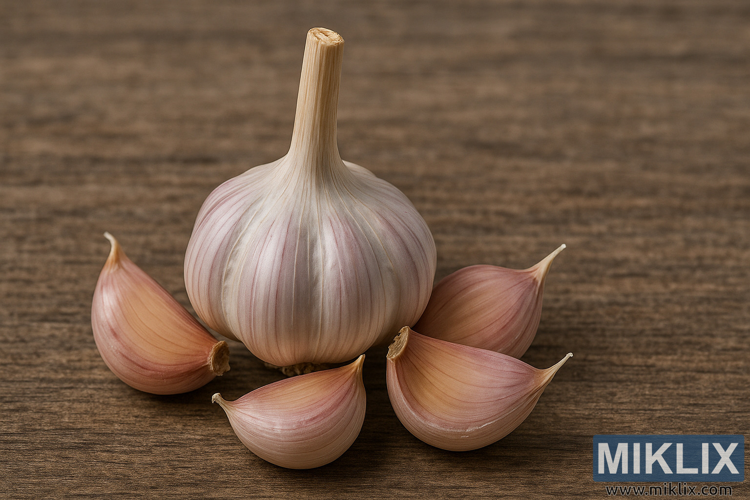 High-detail photo of a hardneck garlic bulb with its central stem and loose cloves arranged on a rustic wooden background—ideal for illustrating garlic varieties suited to cold climates.