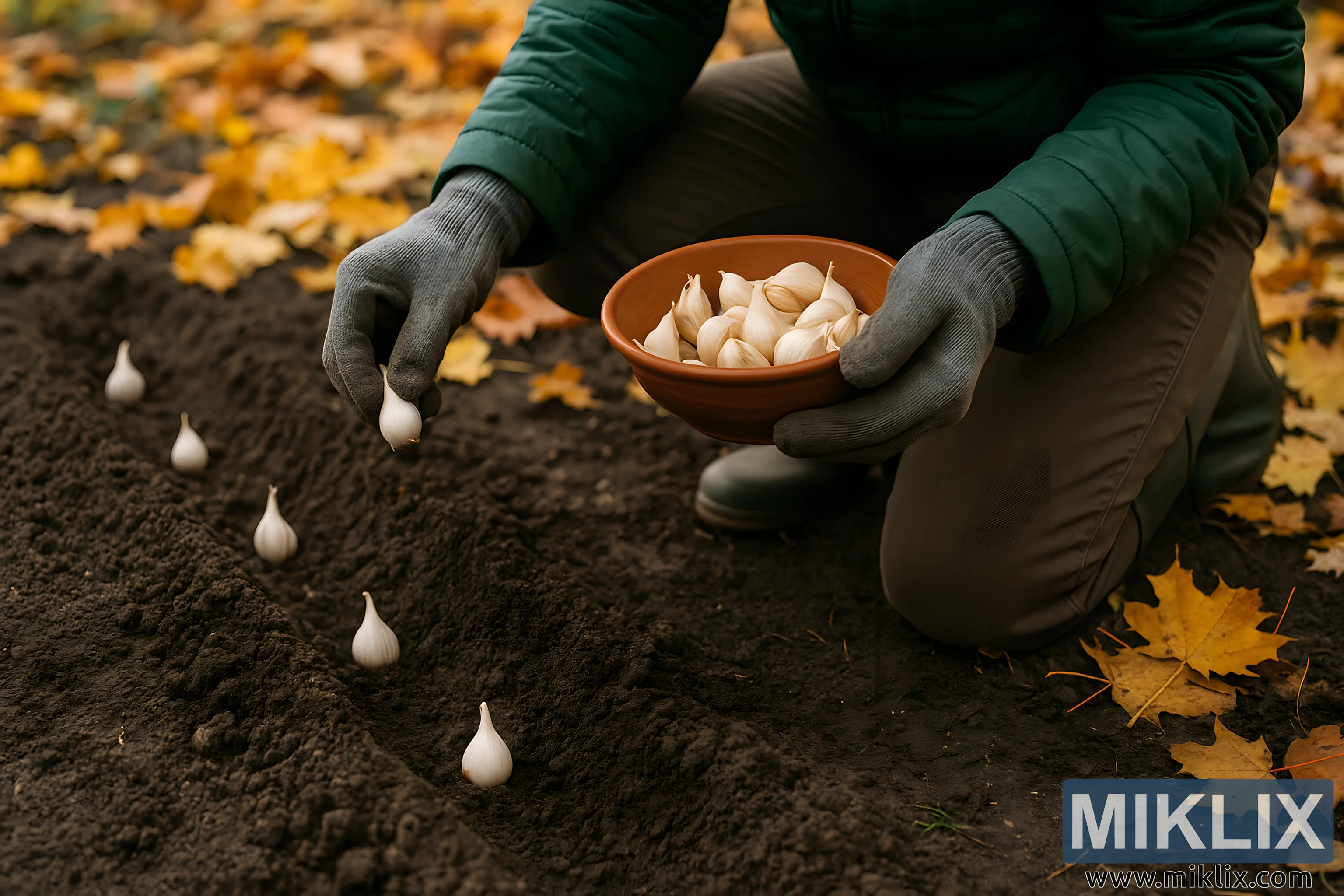 The image depicts a close-up, autumnal gardening scene in which a gardener is carefully planting garlic cloves into dark, freshly prepared soil. The gardener, dressed in a forest-green quilted jacket, sturdy brown pants, and gray work gloves, is kneeling on the ground with one knee bent, leaning slightly forward to position each clove with precision. In their left hand, they hold a simple terracotta-colored bowl filled with smooth, cream-colored garlic cloves, each one plump and unblemished. Their right hand is captured mid-motion, gently lowering a single clove into a shallow trench of loose, well-tilled earth. The row already contains several garlic cloves, each placed upright with pointed ends facing skyward and spaced evenly to allow room for future growth. The soil looks rich and soft, forming small ridges along the trench where the gardener has worked methodically. Scattered across the background and edges of the frame are numerous fallen autumn leaves in shades of golden yellow, burnt orange, and muted brown, creating a warm seasonal atmosphere. These crisp leaves contrast visually with the deep brown soil and the pale garlic cloves, enhancing the sense of fall gardening. Only the gardener’s torso, arms, and legs are visible, emphasizing the hands-on activity rather than the identity of the person. The overall lighting is soft and natural, likely filtered through an overcast autumn sky, giving the image an earthy, tranquil mood. The combination of meticulous placement of the cloves, the texture of the soil, and the vivid fall foliage conveys a sense of preparation, patience, and the timeless rhythm of seasonal planting.