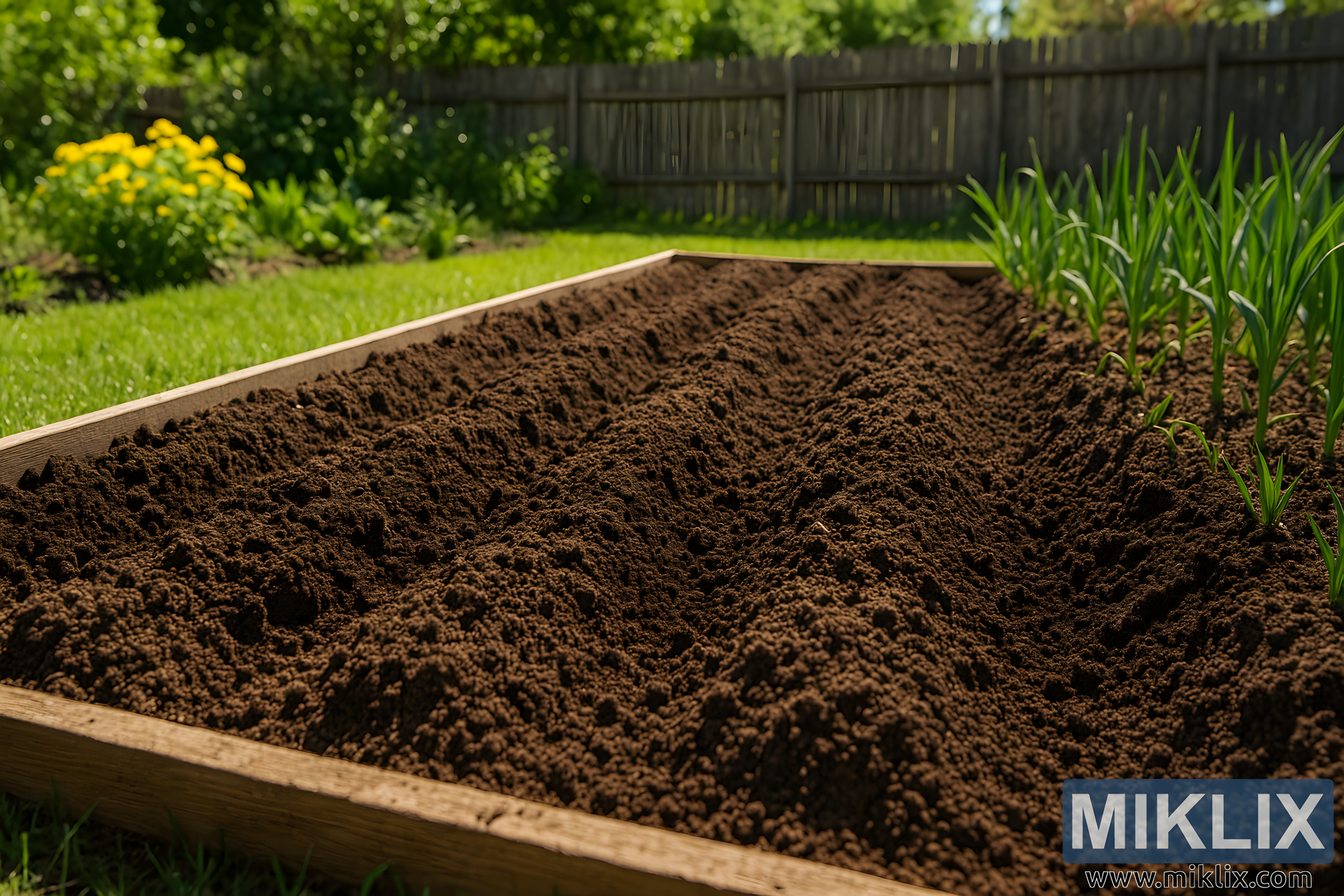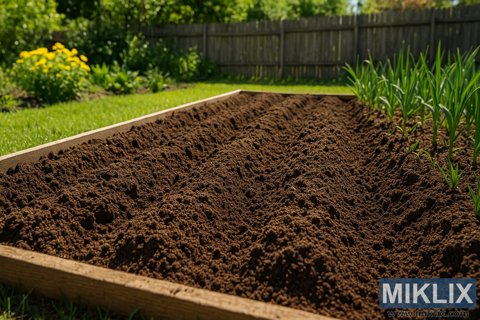 This image depicts a sunlit garden bed meticulously prepared for planting garlic. Framed in a landscape orientation, the scene captures the warm, golden light of a sunny day illuminating a rectangular raised bed filled with rich, dark, well-drained soil. The soil appears freshly turned and carefully shaped into evenly spaced mounds and furrows running the length of the bed, suggesting thoughtful preparation for planting. The texture of the soil is detailed and loose, with small clumps and fine granules that indicate good tilth and aeration—ideal conditions for garlic cultivation. Along the right side of the bed, a neat row of young garlic plants is already emerging, their green leaves standing upright and catching the light, offering a sense of growth and productivity. Beyond the raised bed lies a vibrant lawn of closely trimmed grass leading toward a weathered wooden fence at the back of the scene. Clusters of lush vegetation surround the area, with bright yellow flowers blooming on the left side, adding a cheerful splash of color against the surrounding greenery. Various trees and shrubs fill the background, their leaves softly diffusing the sunlight and creating a gently shaded border that contrasts with the brightness of the garden bed. The overall atmosphere of the image conveys calmness, readiness, and natural abundance, capturing a moment just before planting in a well-tended garden space.