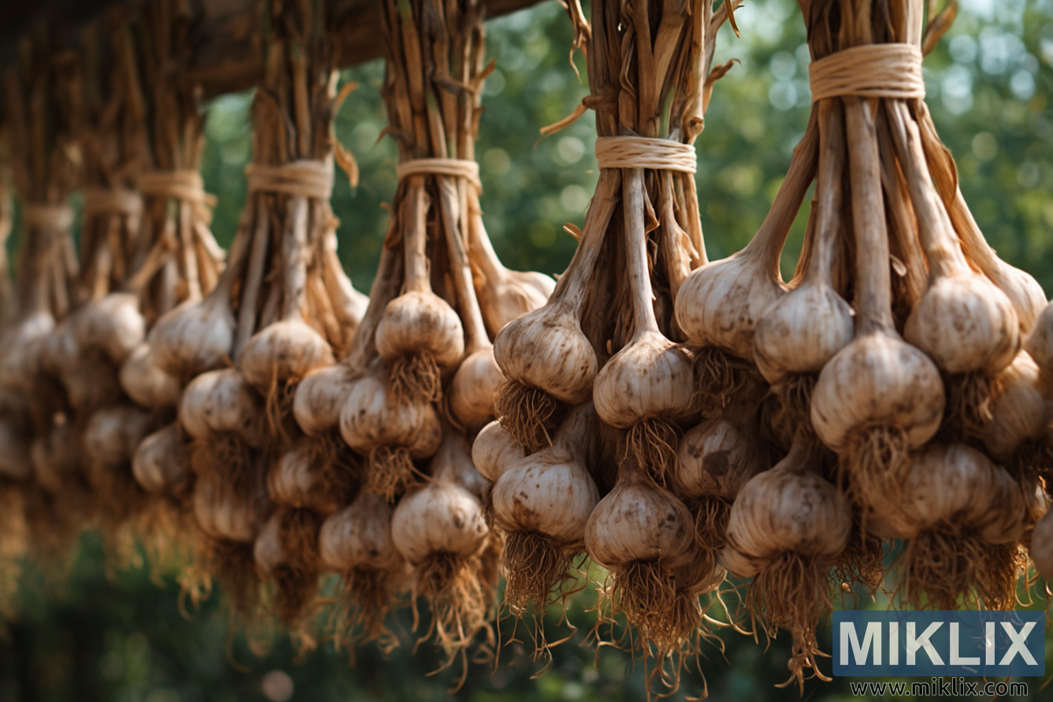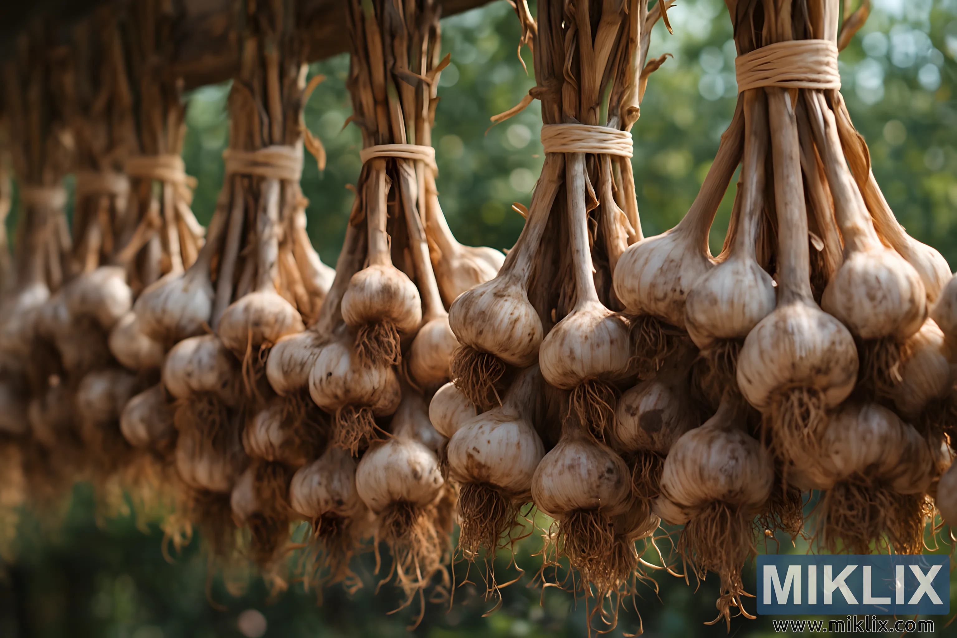 High-resolution photo of garlic bulbs tied in bundles and hung to cure in a well-ventilated outdoor setting, showcasing natural textures and warm earthy tones.