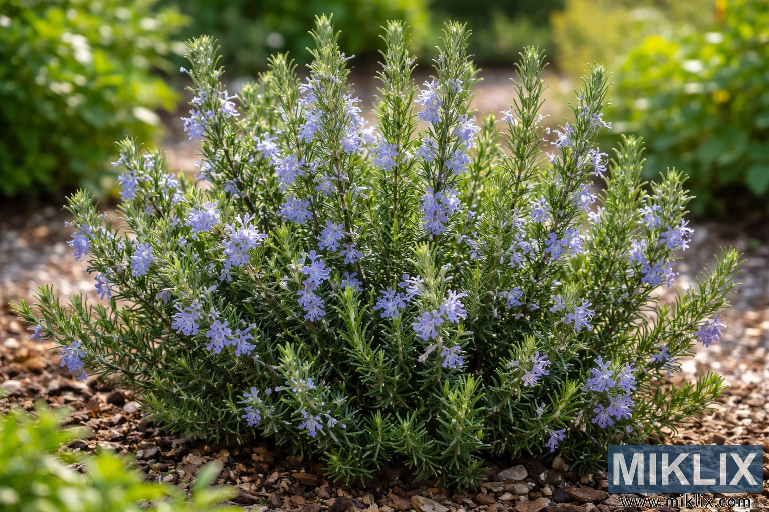Overall, the image conveys a sense of vitality and calm typical of a well maintained herb garden. The rosemary plant looks robust and aromatic, with its blue flowers indicating active growth and seasonal bloom. The natural lighting, earthy garden bed, and surrounding greenery together create a peaceful scene that highlights the beauty and usefulness of this common culinary and ornamental herb.
