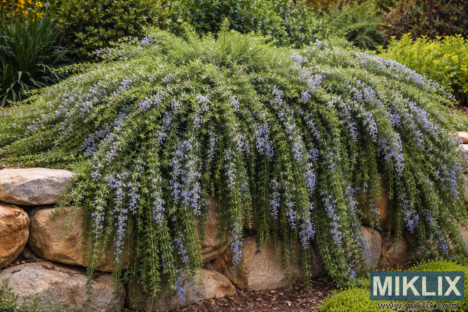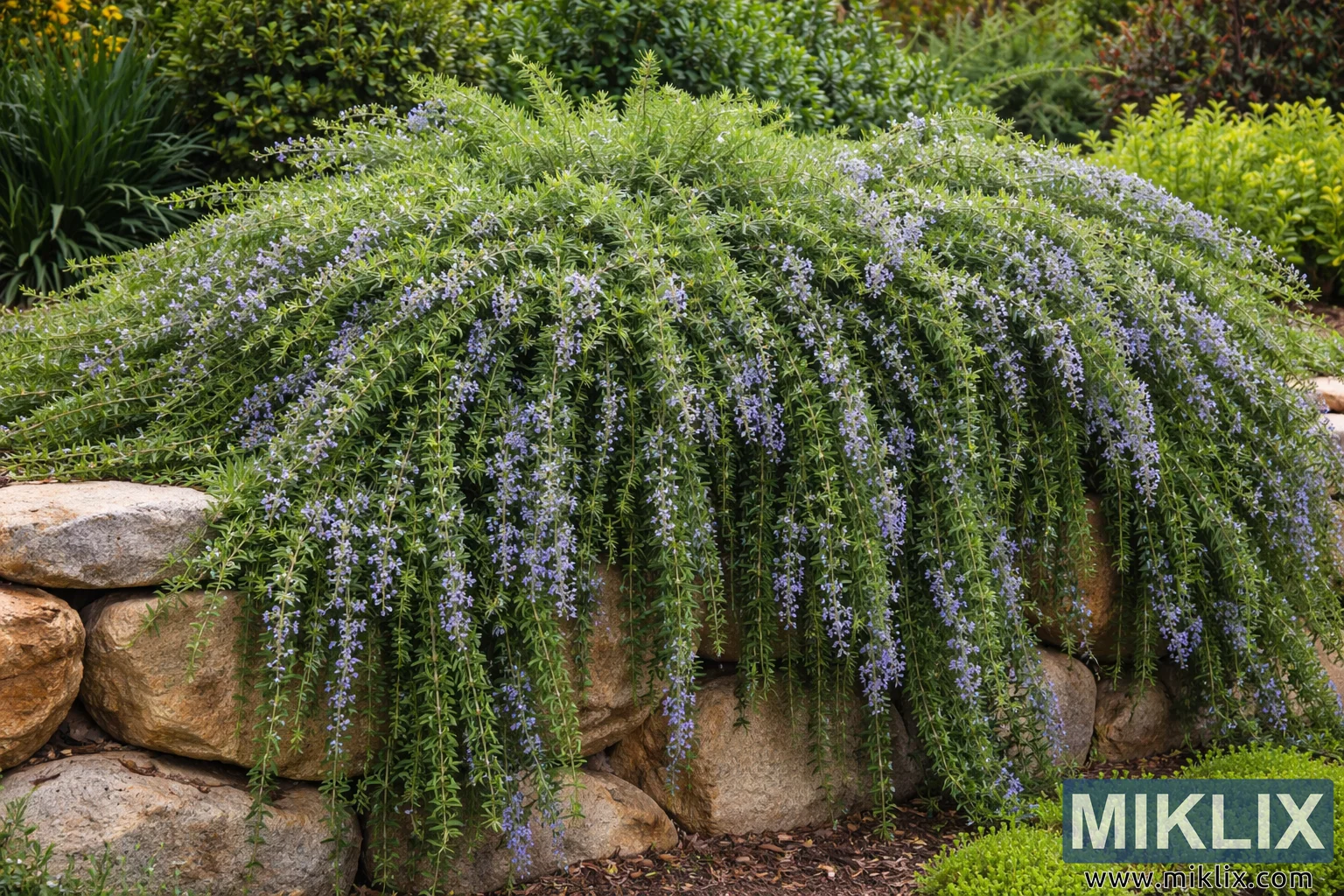 Overall, the photograph captures the ornamental beauty and distinctive growth habit of prostrate rosemary. The plant’s cascading structure, delicate flowers, and evergreen foliage combine to create a visually rich garden focal point that demonstrates how this Mediterranean herb can function both as a culinary plant and as an attractive groundcover or wall-spilling landscape feature.