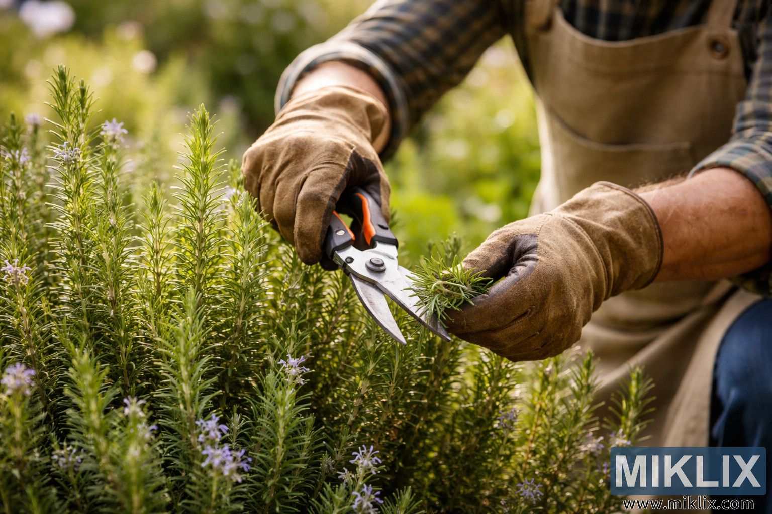 High-resolution photo of a gardener carefully pruning a healthy rosemary plant with pruning shears in a sunlit garden setting.