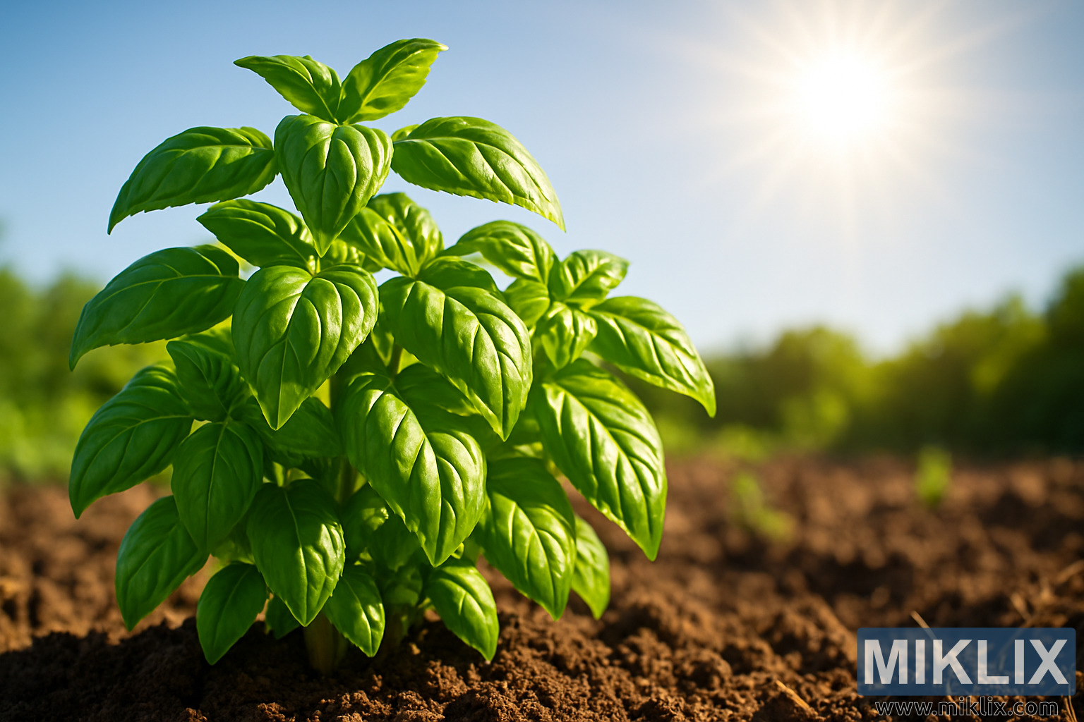 A healthy, sun-lit basil plant thriving in optimal growing conditions, with lush green leaves and rich garden soil.