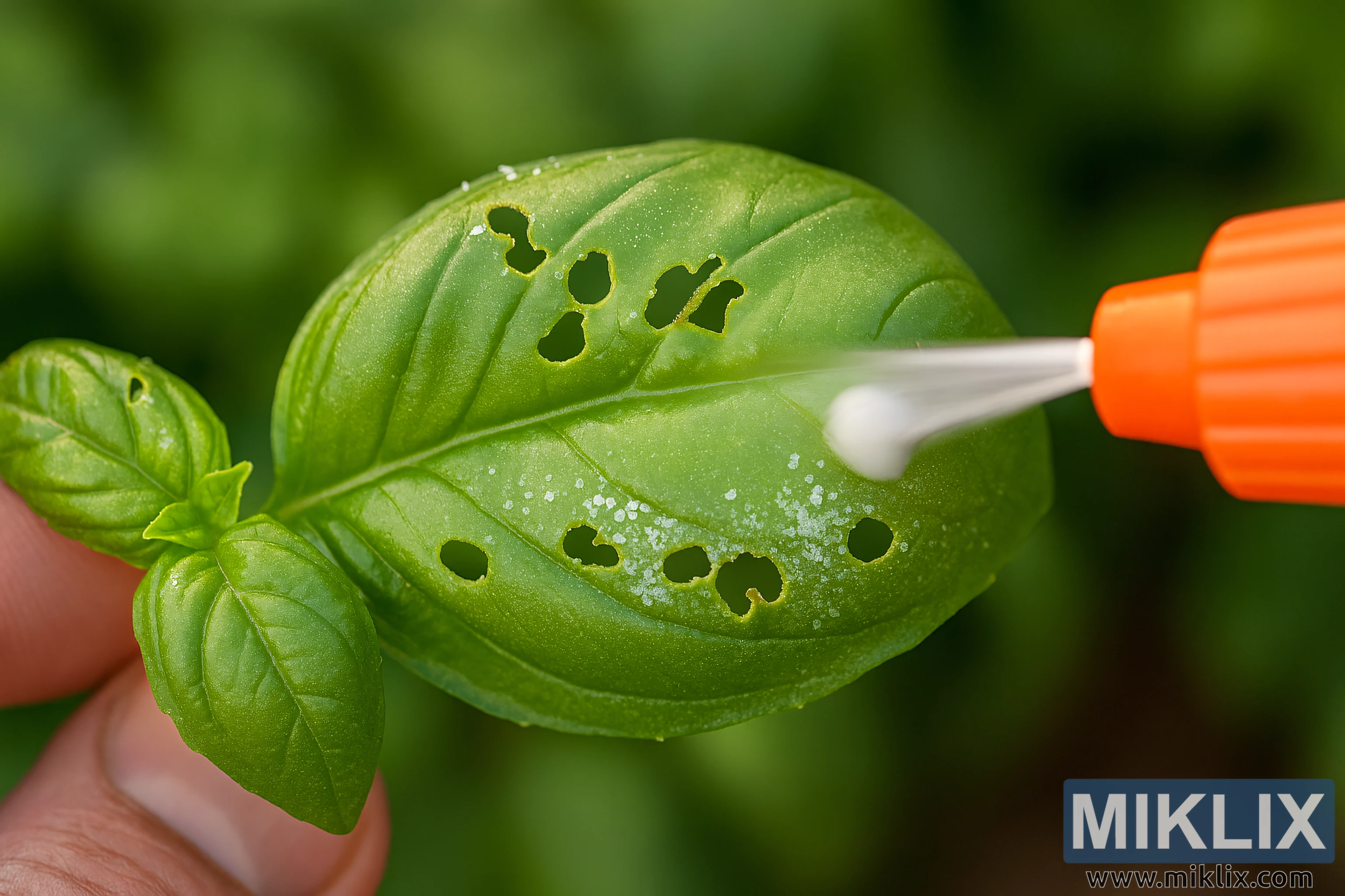 High-resolution image showing pest damage on a basil leaf and organic treatment being applied with a spray nozzle