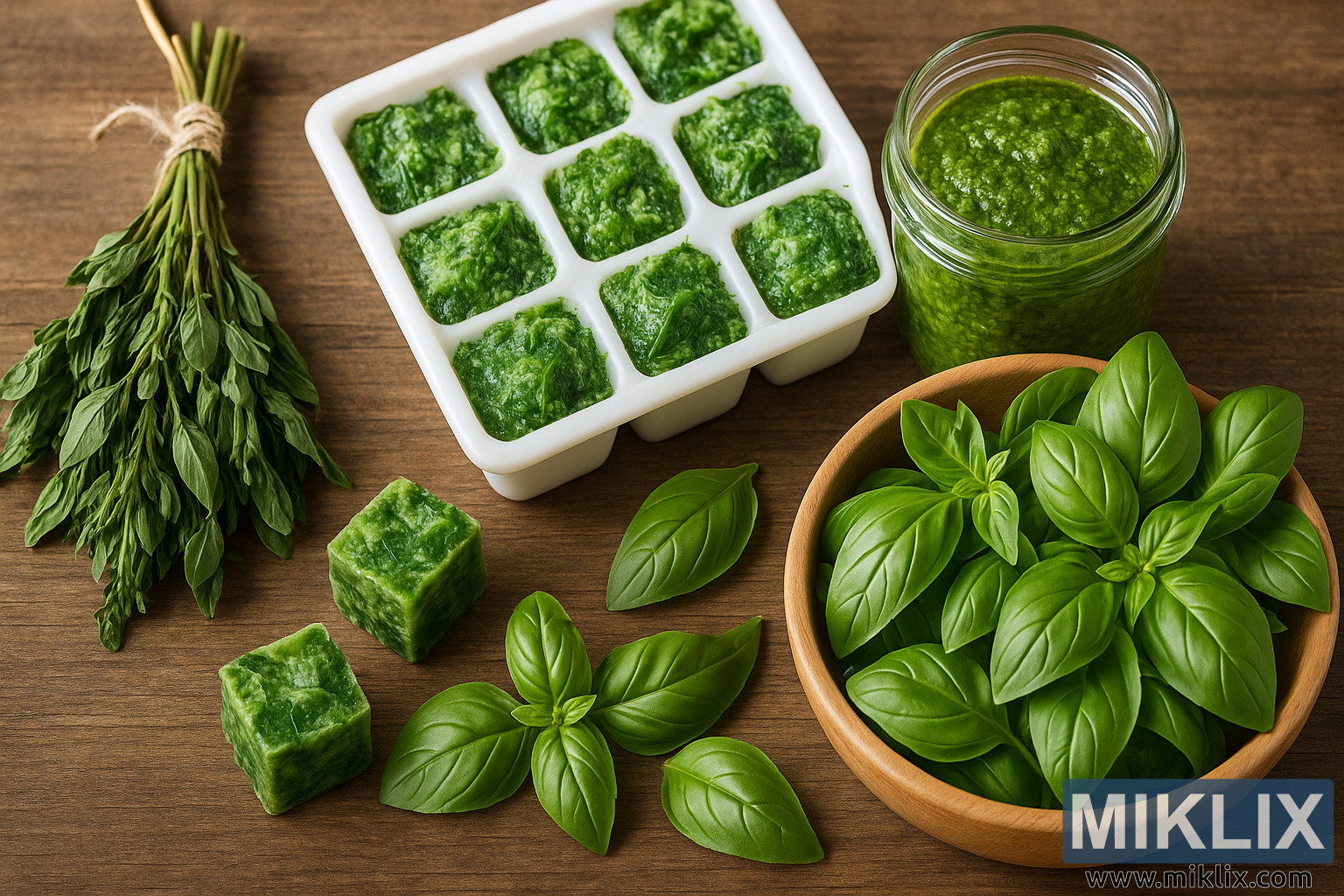 Together, these elements form a cohesive and educational composition that visually documents three primary ways of preserving basil: drying, freezing, and blending into pesto. The layout is clean and intentional, guiding the viewer’s eye across each stage of basil’s culinary journey. The natural lighting enhances the textures and colors of each component, celebrating basil’s versatility in the kitchen while demonstrating practical options for reducing waste and storing seasonal herbs for future enjoyment.