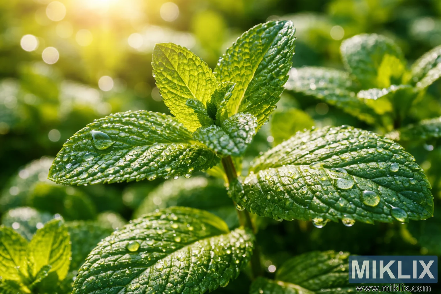Macro-style close-up of vibrant green mint leaves covered in morning dew, illuminated by soft golden sunlight with a blurred natural background.