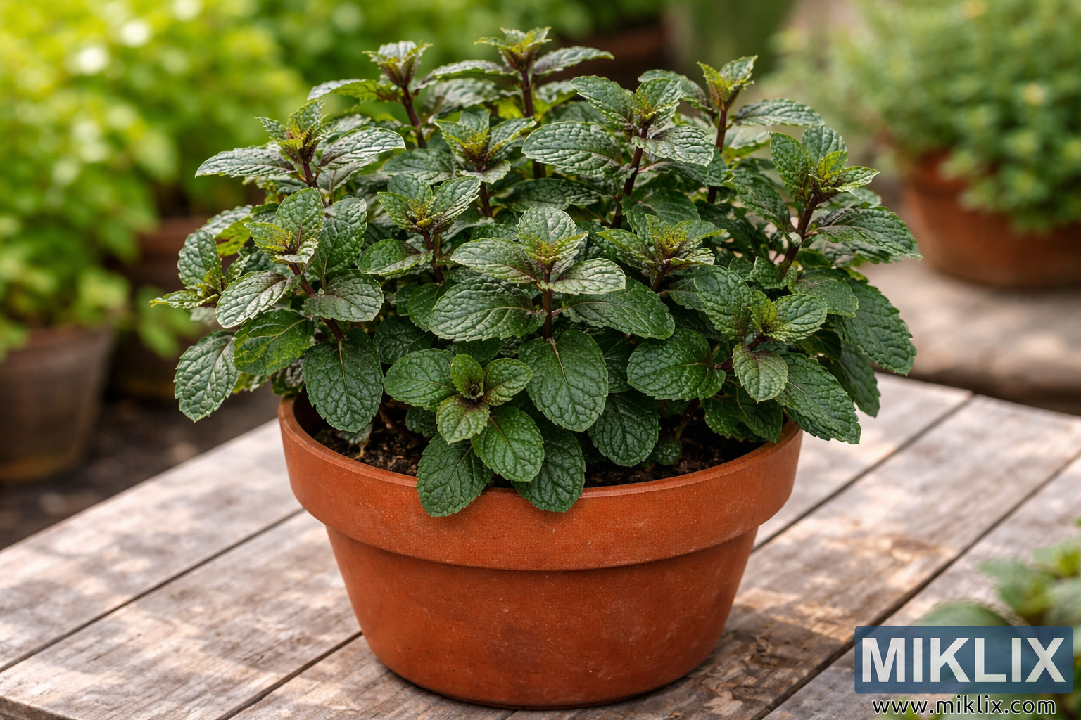 Close-up photograph of a lush chocolate mint plant with dark green leaves in a terracotta pot, placed on a rustic wooden table in a bright garden setting.