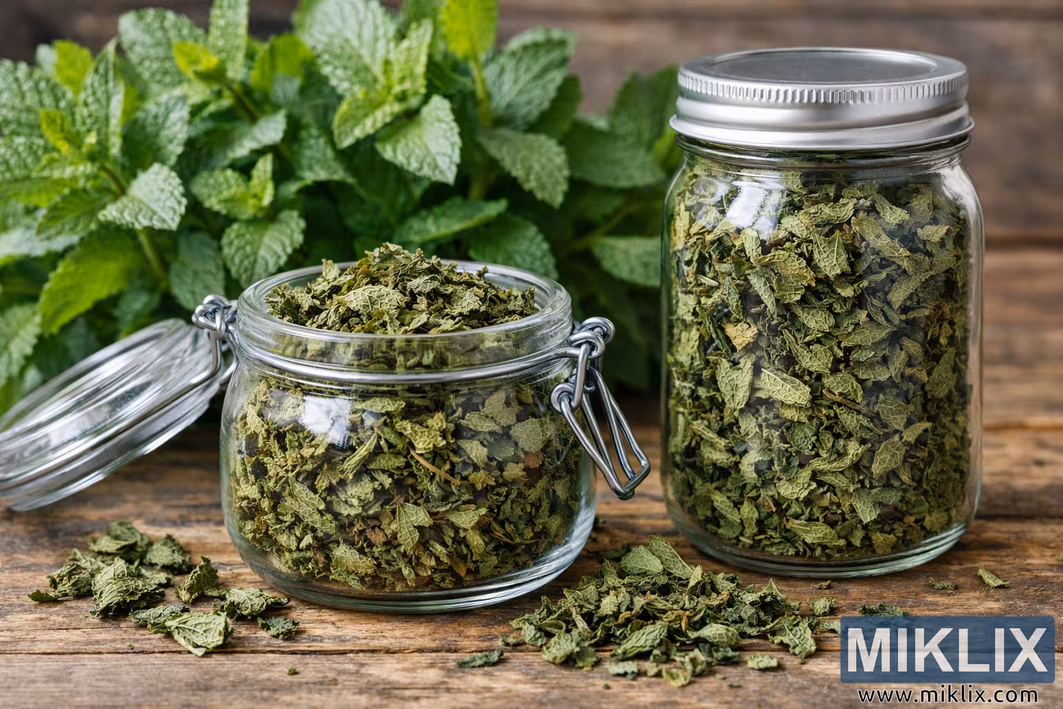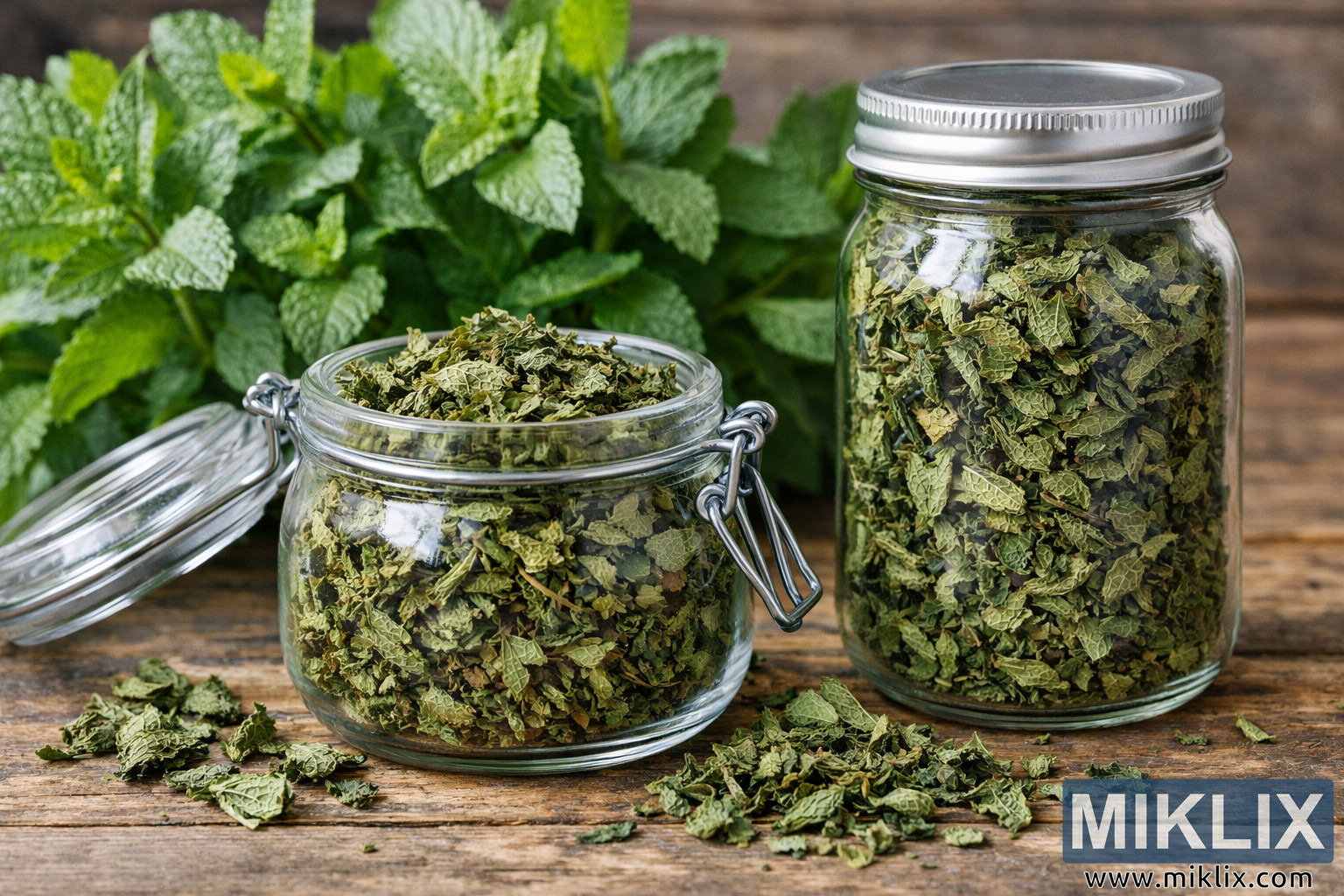 Landscape photo of dried mint leaves stored in glass jars on a wooden surface, with fresh mint stems softly blurred in the background.