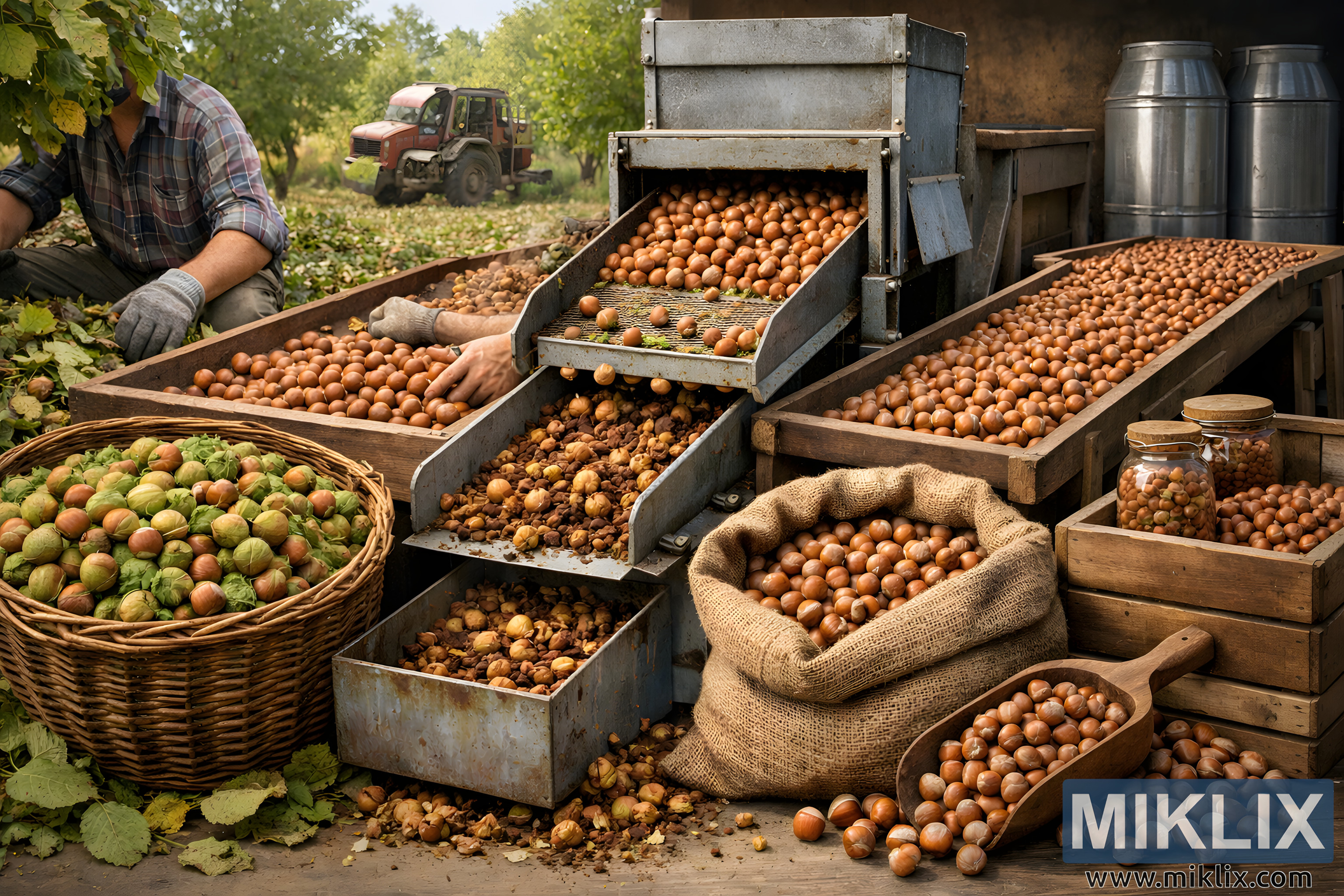 Detailed image of hazelnut harvesting and processing, illustrating collection in the orchard, mechanical sorting, and storage in crates and sacks.