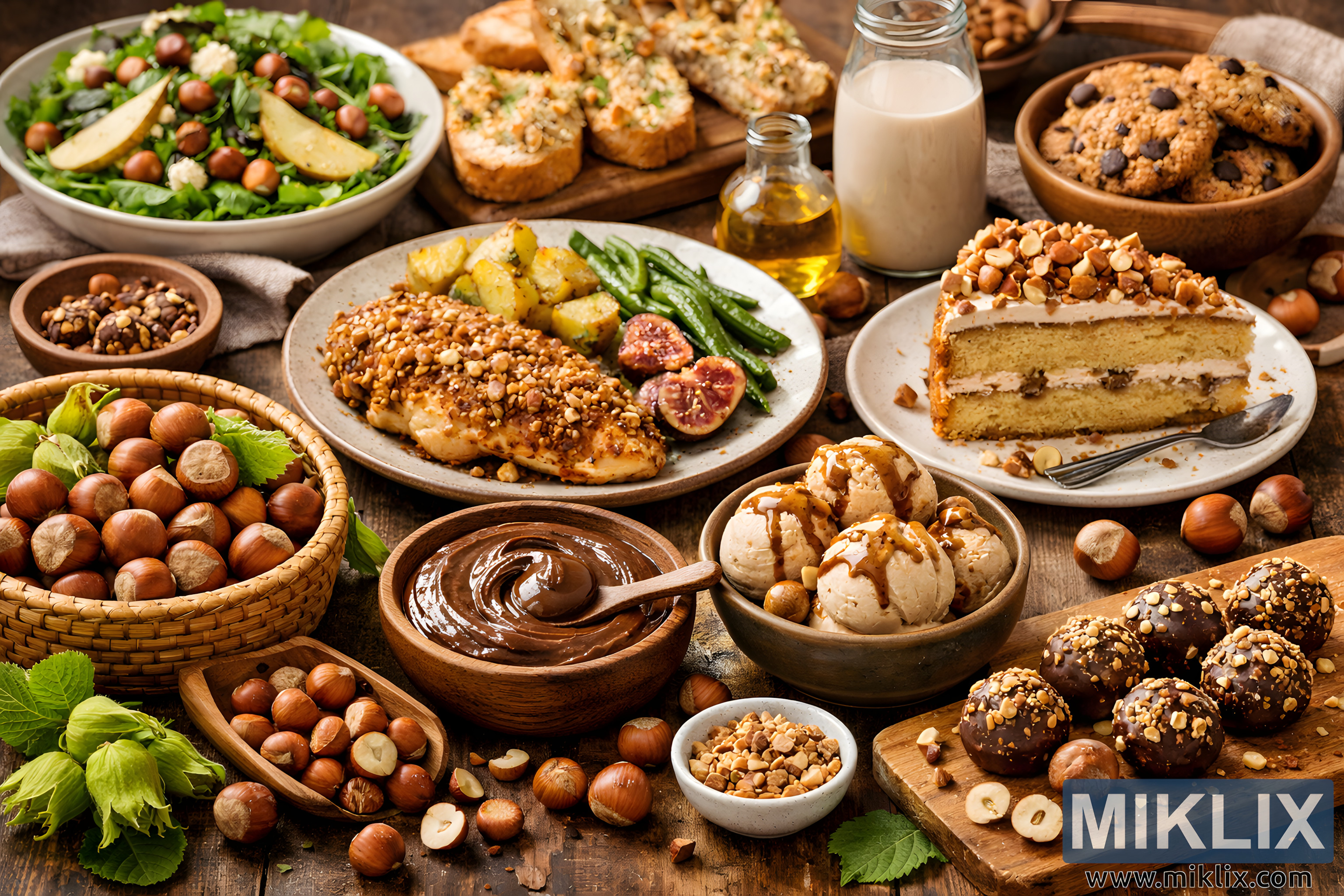Glass bottles containing hazelnut milk or oil add another dimension, suggesting beverages and cooking ingredients derived from the nut. The overall arrangement feels abundant yet carefully styled, with each dish placed to showcase a different use of hazelnuts. Natural materials such as wood, ceramic, and woven fibers reinforce an artisanal, farm-to-table aesthetic. The image as a whole conveys versatility, seasonality, and culinary creativity, presenting hazelnuts as a central ingredient that seamlessly bridges savory and sweet cuisine.