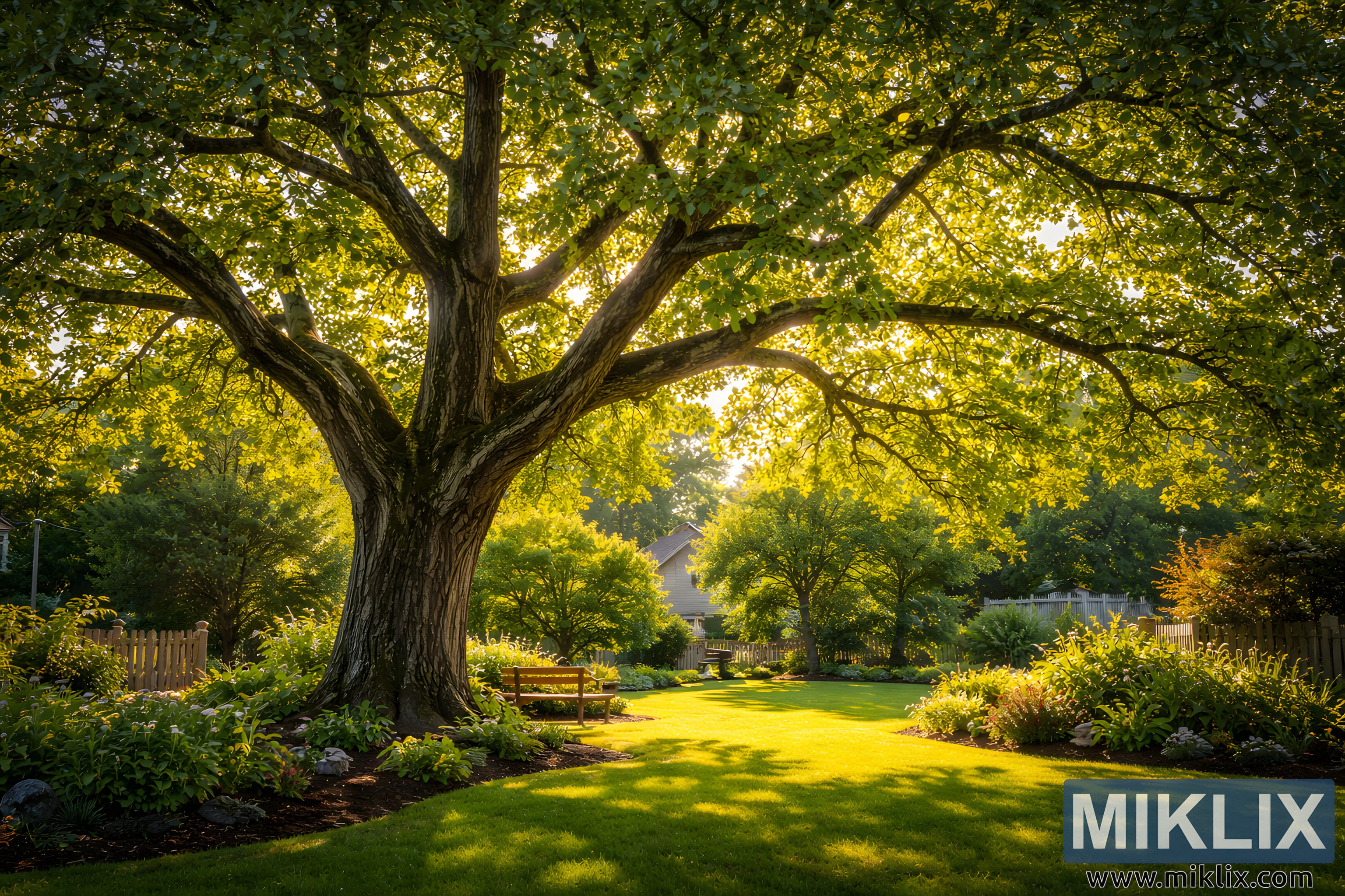 Beneath the tree, the garden is carefully maintained yet relaxed in character. A well-kept lawn stretches across the foreground, its grass evenly trimmed and vibrantly green. The shadows of the branches fall softly across the lawn, emphasizing the time of day as late afternoon or early evening. Near the base of the trunk, low-growing plants and mulch form a neat border, blending ornamental gardening with the natural presence of the tree. A simple wooden bench sits nearby, positioned to take advantage of the shade and the tranquil atmosphere, inviting quiet rest or contemplation.