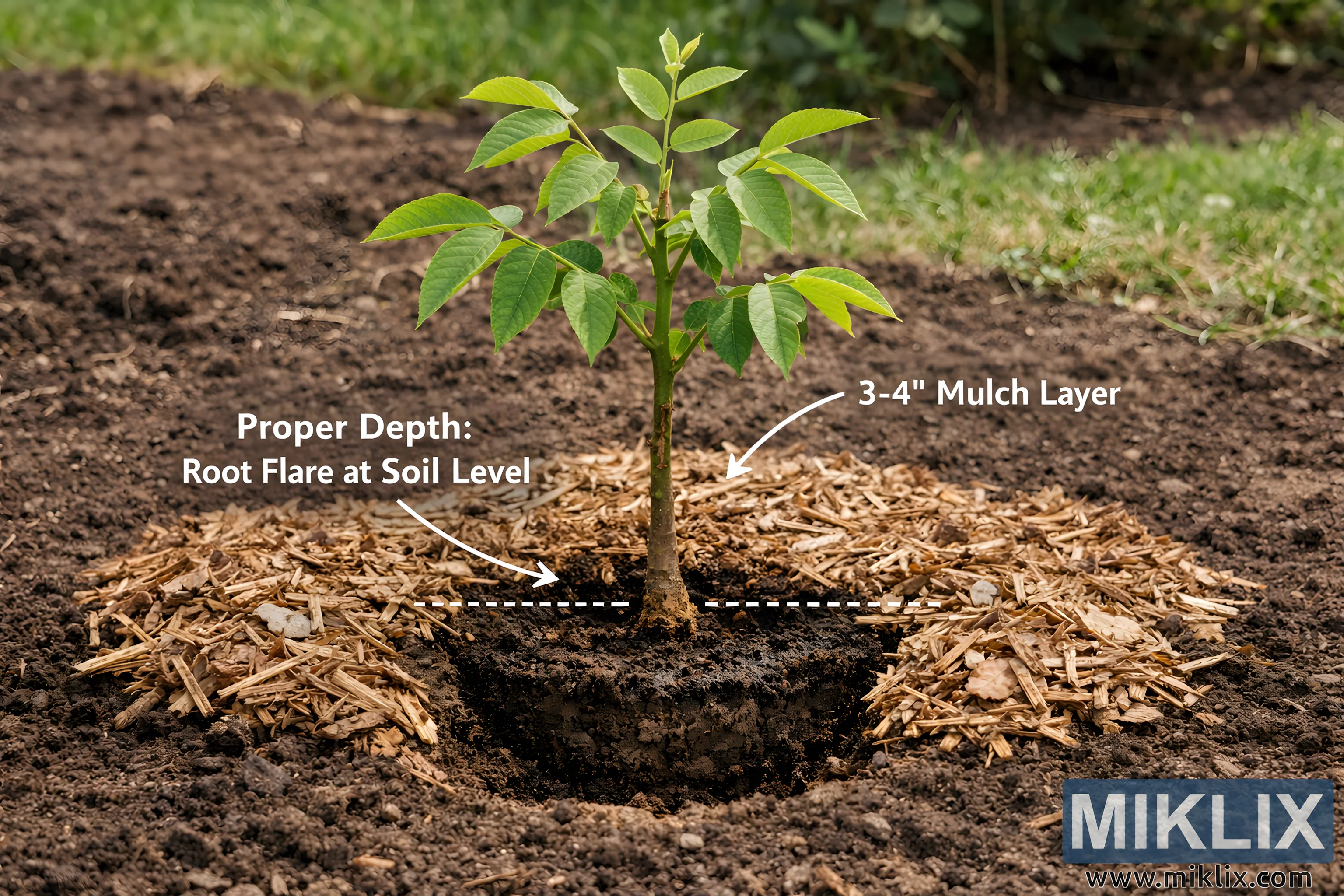 Educational photo showing correct planting depth and mulching technique for a young walnut sapling, highlighting visible root flare and proper mulch placement.