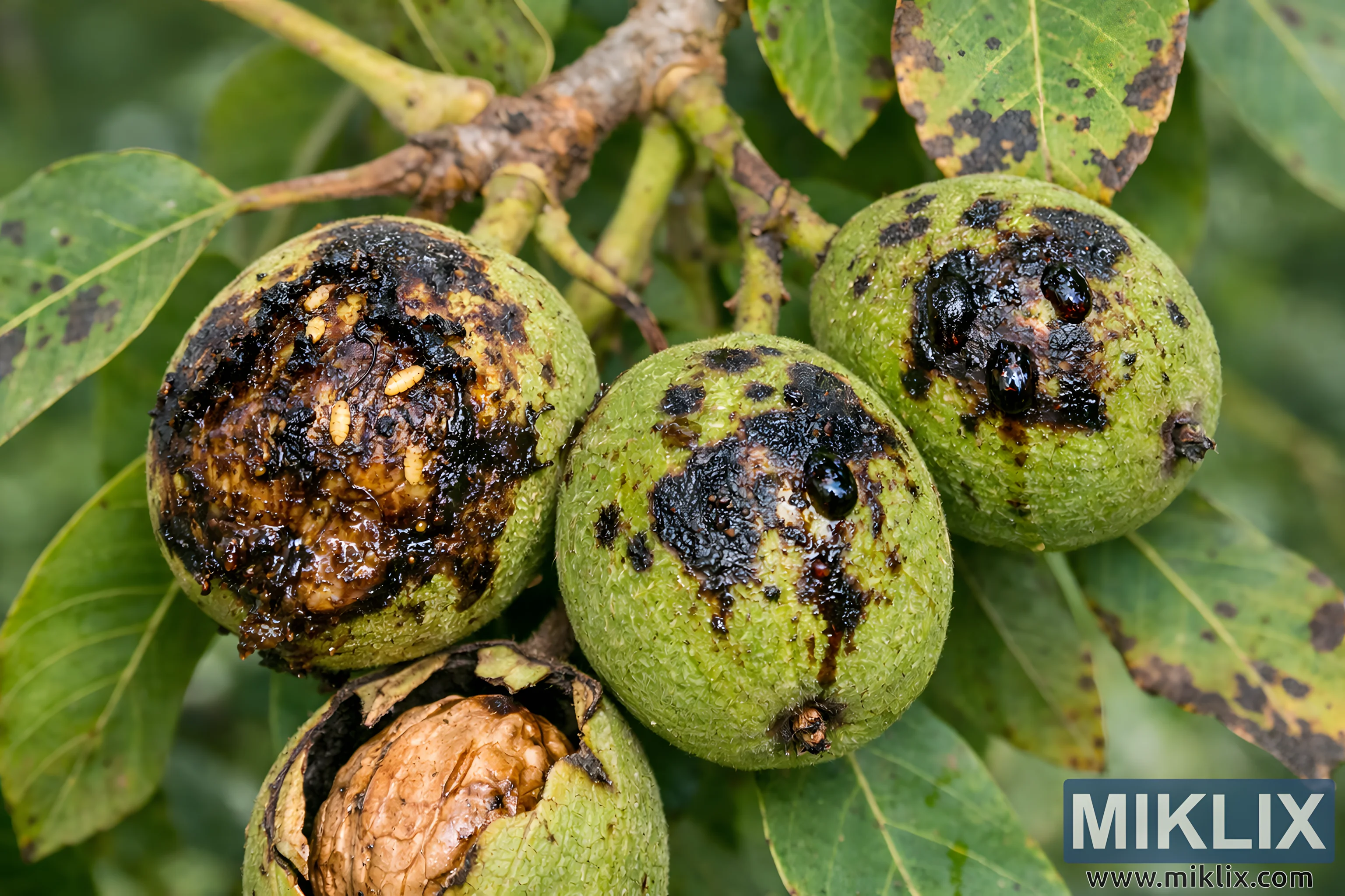 Image: Walnut Husk Fly Damage and Walnut Blight Symptoms on Green Walnuts